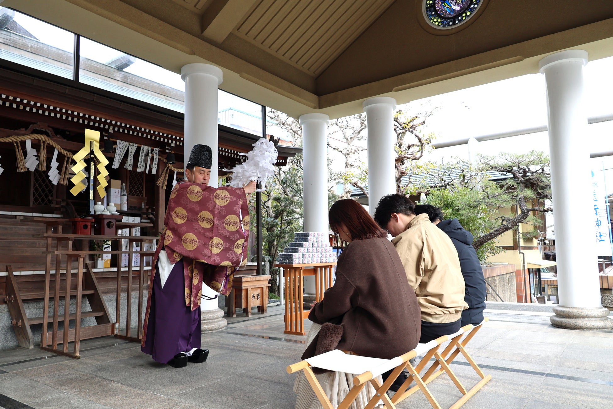 寒さの残る空の下、担当者が今年の航空安全お守りを持参し、飛行神社でご祈祷を受けました。