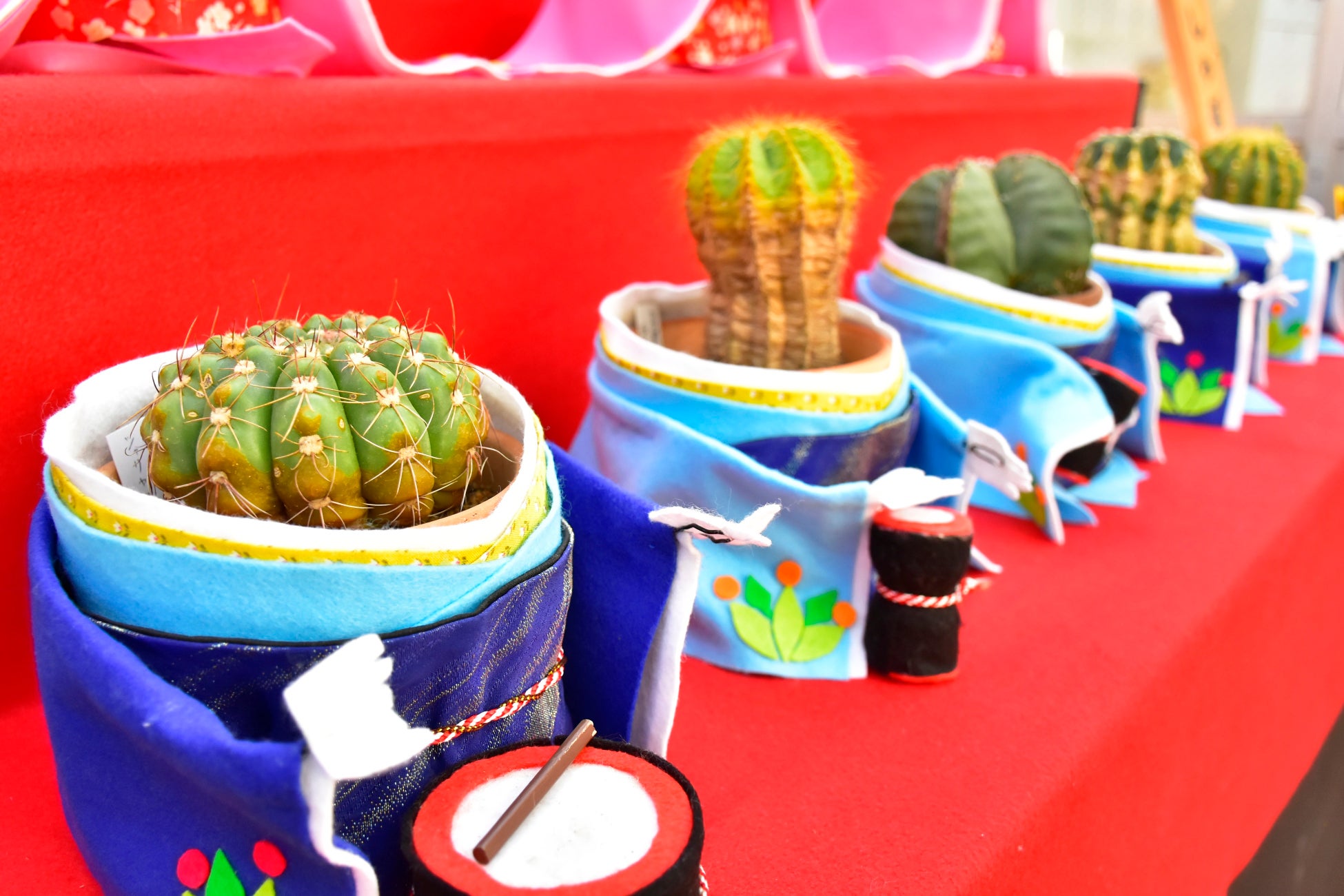 五人囃子には「豊明丸(ホウメイマル)」「ワラシー」「紫源氏車(ムラサキゲンジグルマ)」「芍薬丸(シャクヤクマル)」「タマウリ鸞鳳玉(タマウリランポーギョク)」を配すなど、それぞれの役に扮したサボテンの個性も楽しめるようになっております。
