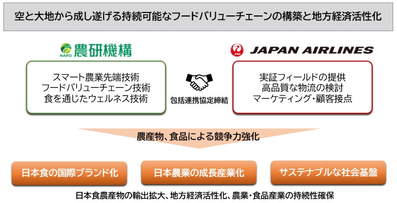 国立研究開発法人農業・食品産業技術総合研究機構(本部:茨城県つくば市、理事長:久間 和生、以下「農研機構」)と日本航空株式会社(本社:東京都品川区、代表取締役社長 グループCEO:鳥取 三津子、以下「JAL」)を中心とするJAL グループは、このたび、日本の農業・食品産業のさらなる発展と環境保全への貢献を目指し、包括連携協定を締結しました。