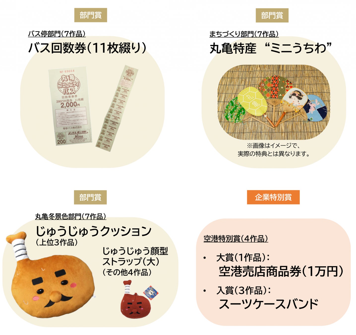 入賞特典は、丸亀市役所でのお渡しを予定しております。詳細は応募期間終了後、審査を経て、受賞者の方へ個別にご連絡いたします。