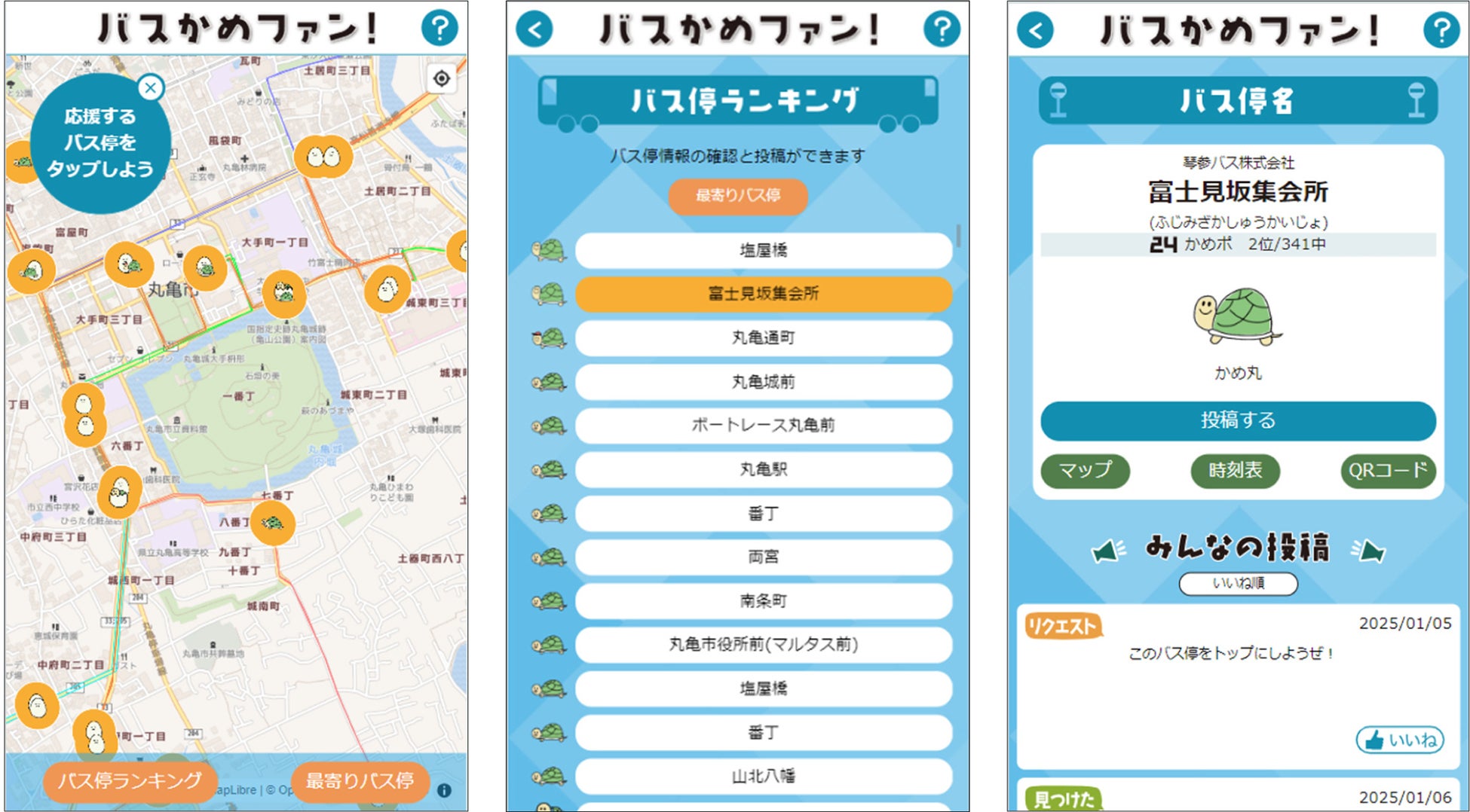 バスを楽しみ(fun)、丸亀のファン(fan)の輪を広げる《バスかめファン!》は、丸亀市内のバス停についての要望や周辺スポットのシェアしたい情報を投稿したり「いいね」することで、各バス停に住むキャラクター「かめ丸」をみんなで育てる、ゲーム要素を持った実証実験中のWebアプリです。地域住民・交通事業者・行政・観光客などの多様なステークホルダーをつなぐプラットフォームとなり、バスや地域の魅力を発掘します。公共交通の利用を促進することで地域の活性化を図る、新たなまちづくりの取り組みの一環です。