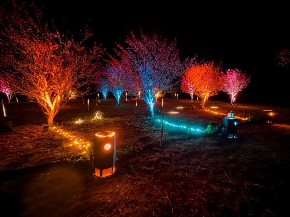 梅林の新たな魅力を発見: 昼間とは異なる幻想的なライトアップ演出で、梅の花の美しさが際立つ。