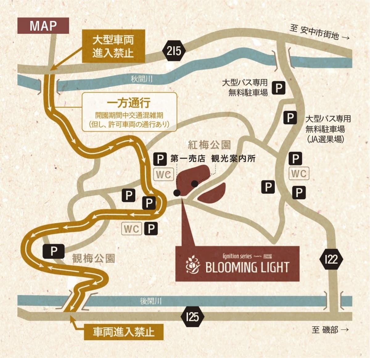 開催場所: 秋間梅林 イルミネーション入り口第一売店付近にて受付