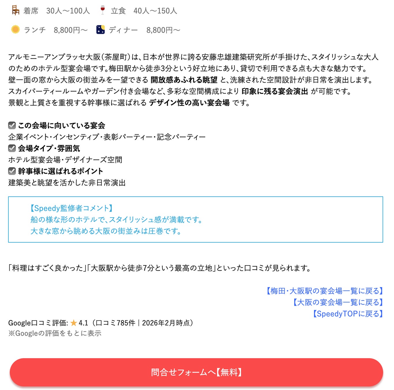 大阪の宴会場・パーティー会場を探す幹事向け比較サービス「Speedy」。大阪エリア176会場を掲載し、強みタグや料理ジャンルから効率的に比較できます。
