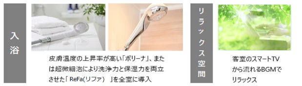 一部客室には、洗浄力と保湿力を両立させた「ReFa(リファ)」のシャワーヘッドおよびドライヤーを設置し、ロビーには、好みに応じて選べる枕棚を備えるなど、設備面においても快適性を高めました。
