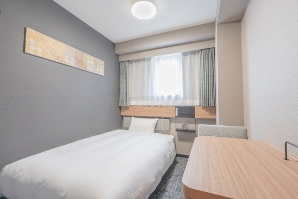 今回のリニューアルでは、客室の内装デザインを刷新するとともに、シングルルームには広い天板のワイドデスクをテレビが見やすい位置に配置するなど、機能性を高めるレイアウトへ改善しております。