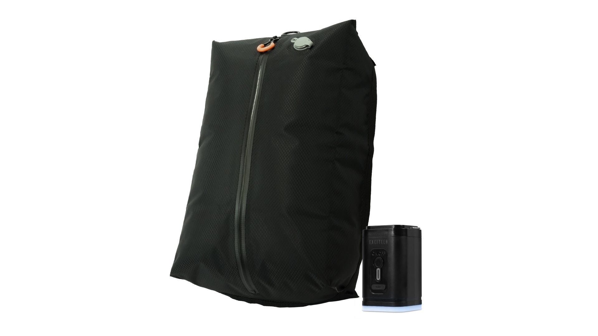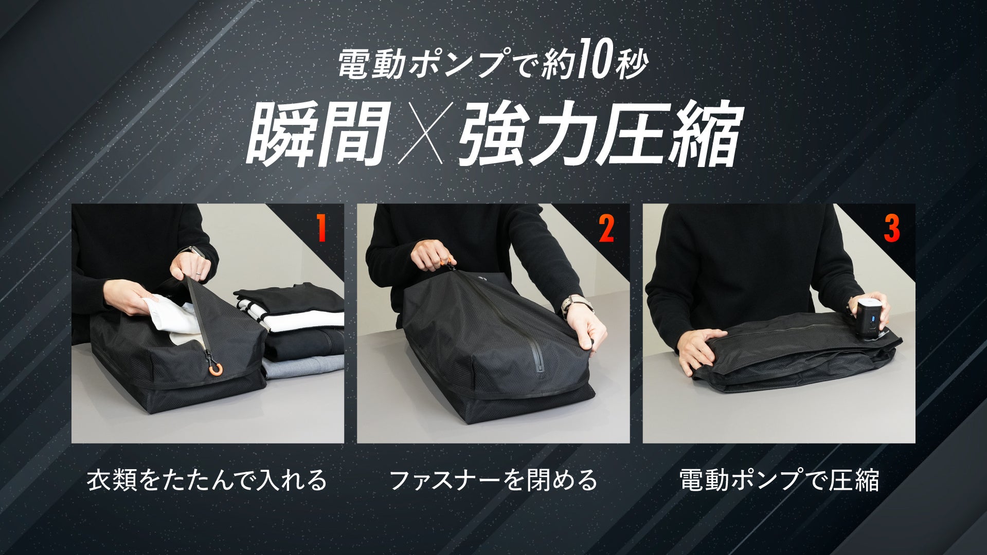 『EXCITECH COMPRESS POUCH + AIR PUMP』は、約1〜3泊分の荷物が入る大容量サイズで、電動ポンプで約10秒*吸引するだけで、広々とした空間を確保しやすいのが特長です。