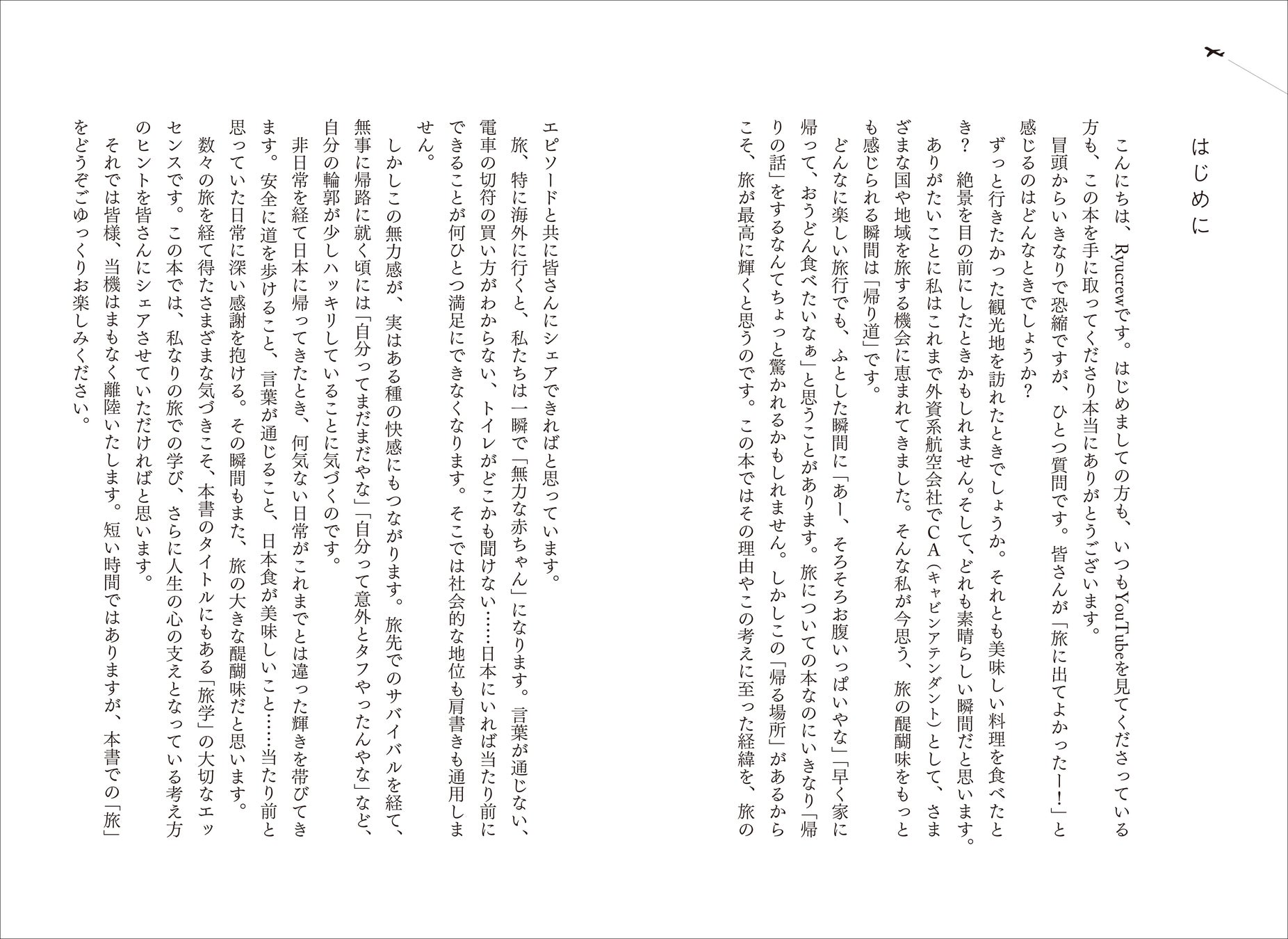 本書は、世界中の空を飛び回る国際線外資系CAであるRyucrew氏が、“なぜ、人は旅をするのか”をテーマに綴った、まったく新しい「旅」の本です。人生の転機はすべて「旅」だったという自身の体験を基に、公私にわたるフライトと旅の日々から得た「人生哲学(旅学)」を余すところなく綴った一冊です。旅を豊かにする実用的なTipsはもちろんのこと、現代を生きる私たちが直面する悩みや迷いに対し、空の上で培った視点から「生き方・考え方」のヒントを提案する内容となっております。