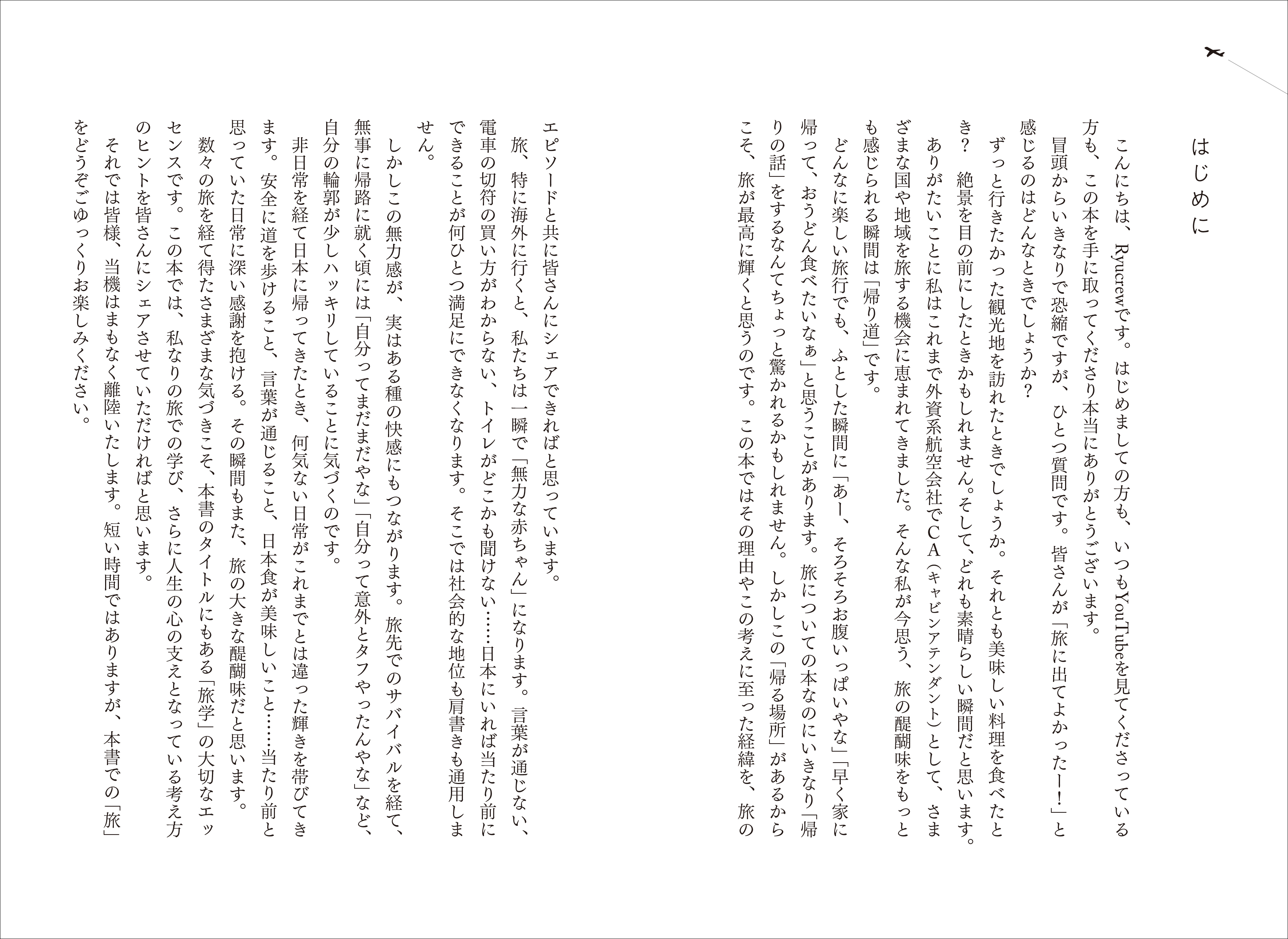 本書は、世界中の空を飛び回る国際線外資系CAであるRyucrew氏が、“なぜ、人は旅をするのか”をテーマに綴った、まったく新しい「旅」の本です。人生の転機はすべて「旅」だったという自身の体験を基に、公私にわたるフライトと旅の日々から得た「人生哲学(旅学)」を余すところなく綴った一冊です。旅を豊かにする実用的なTipsはもちろんのこと、現代を生きる私たちが直面する悩みや迷いに対し、空の上で培った視点から「生き方・考え方」のヒントを提案する内容となっております。