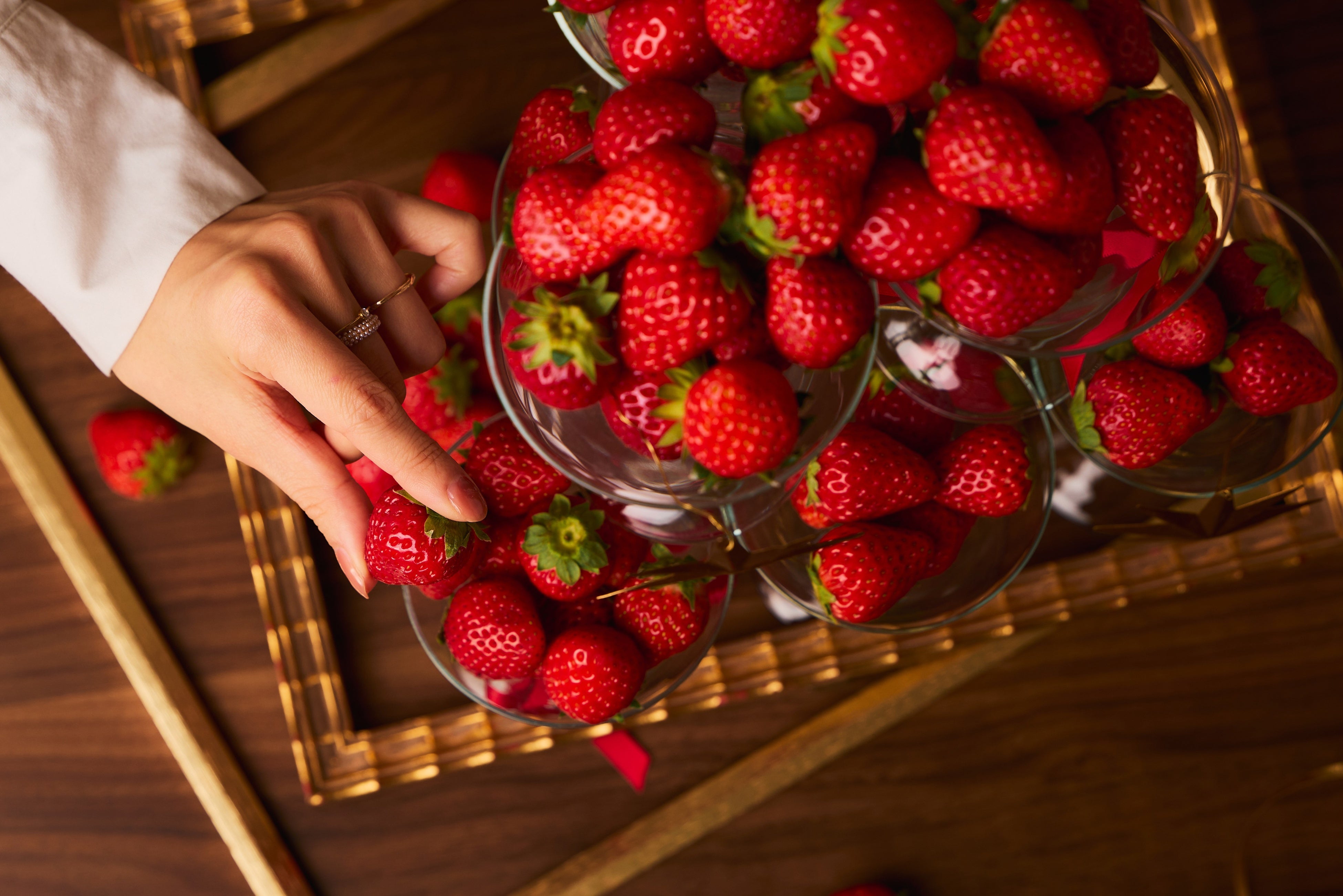 新章を刻む「All Day Dining La Jyho」が贈るストロベリースイーツパーティーの始まりは、期待感を盛り上げる、ウェルカムドリンクとフィンガーフードをご用意してお迎えいたします。