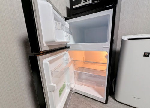 (3) 食事の自由度を確保:客室内には電子レンジと90Lの2層式冷凍冷蔵庫を完備。冷凍食品のストックも可能で、部屋から出ずに食事を済ませたい日の利便性を高めました。また、収納スペースも多く確保しているので、箱買いのペットボトルなどの置き場にも困りません。