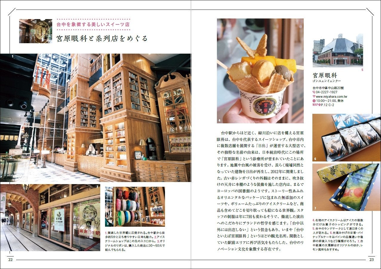 台中のエリア案内/台中を象徴する美しいスイーツ店、宮原眼科と系列店をめぐる/心ときめく朝ごはん・カフェ・スイーツ/タピオカミルクティー発祥の地、春水堂の本店へ/台中のローカルグルメを求めて/台中ならではのおみやげを持ち帰る/複合カルチャースポットへ/台中で出会える文化とアート/歴史ある名建築と憩いの場/台中郊外(彩虹眷村・高美湿地など) ほか