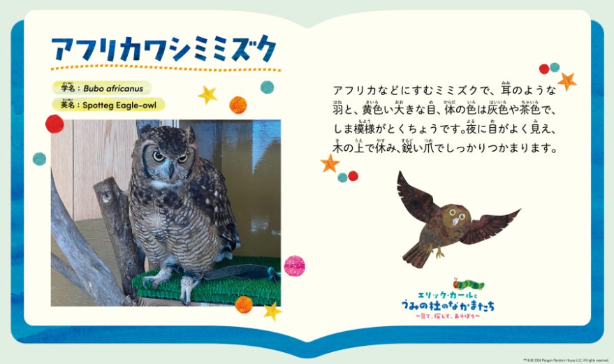 本企画では、まるで絵本の世界から生きものたちが飛び出てきたような特別展示や、生きものたちの知識を学びながら楽しめる生きもの探しカードなどの、色とりどりで、華やかな「エリック・カールが描く生きものたち」を通して、いきいきとした生きもの本来の魅力を体感できるコンテンツが盛りだくさんです。