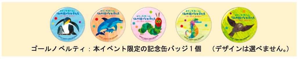 「はらぺこあおむし」は生きものたちと出会い成長し、最後には「ちょうちょ」スタンプを押してゴールです。ゴールした方には、本イベント限定の記念缶バッジ1個(5種類ランダム)をプレゼントいたします。