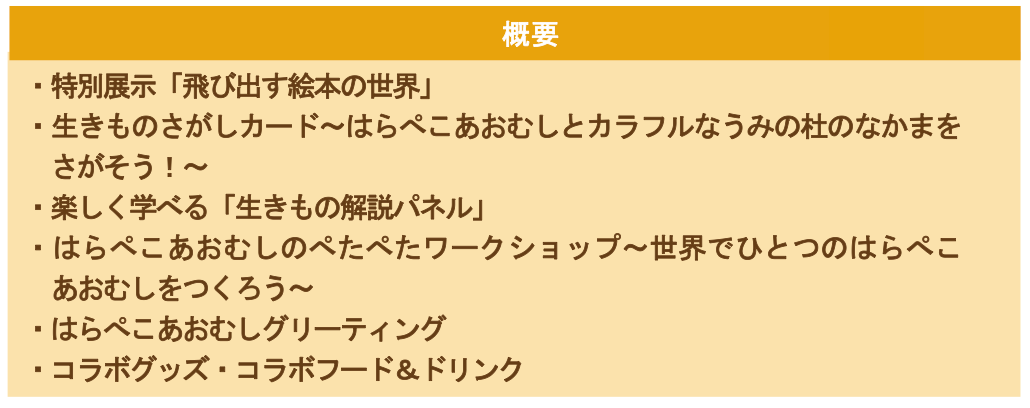 まるで絵本の世界から生きものたちが飛び出てきたような特別展示「飛び出す絵本の世界」や、生きものたちの知識を学びながら館内全体を回遊する生きもの探しカード、本イベント限定のグッズやコラボフードなど、エリック・カールの世界観のもとで、リアルな生きものたちについて体感しながら知ることができます。