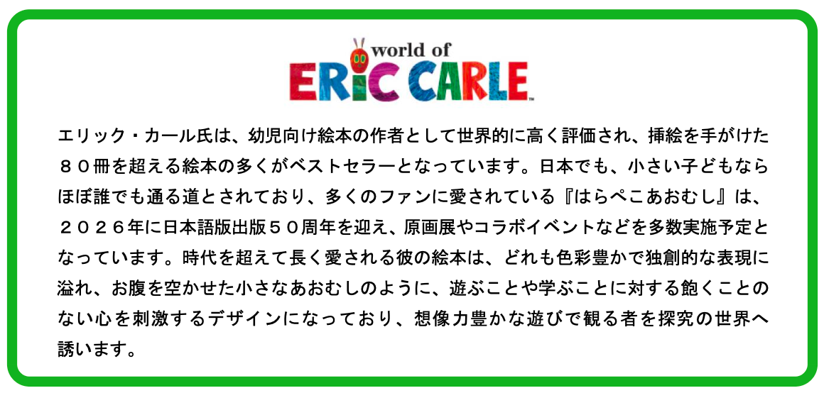 本企画では、色とりどりで、華やかな「エリック・カールが描く生きものたち」を通して、いきいきとした生きもの本来の魅力を体験できるコンテンツが盛りだくさんです。