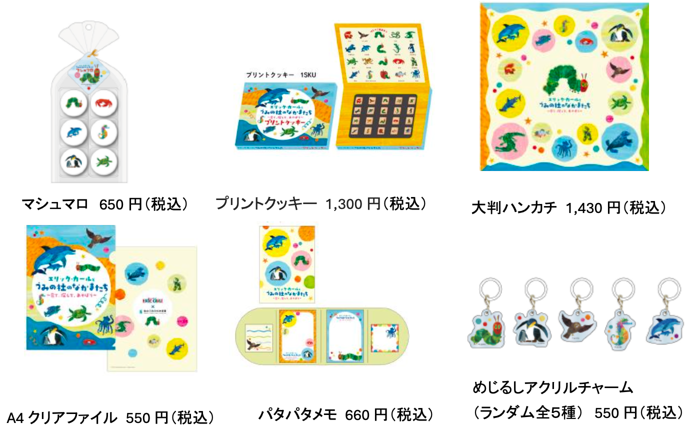 本企画のメインビジュアルを使用したオリジナルコラボグッズを多数販売いたします。また、フードコート「wakuwaku ocean」では、エリック・カール氏の世界観を表現した、ここでしか味わえない見た目もかわいいコラボフードやドリンクを販売いたします。4月21日からは、新たなフード&ドリンクも登場します。お楽しみに!