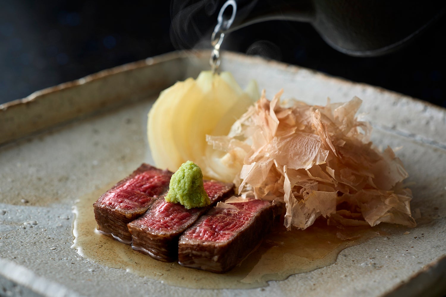 最上級の「FUJIコース」では、和牛フィレの炭火焼きと新玉ねぎのグリルが登場。きめ細やかな和牛フィレに、瑞々しい甘さを蓄えた新玉ねぎを合わせ、ふわりと香るかつお節を贅沢に添えました。仕上げに繊細な出汁をやさしく回しかけると、炭火の香り、肉の旨味、春野菜の甘味が一体となり、滋味深い味わいへと昇華します。