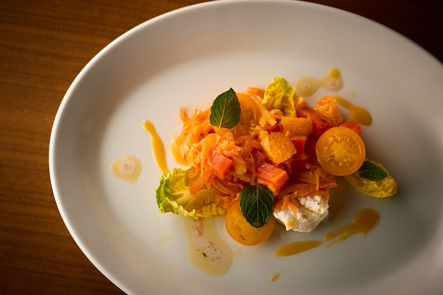 おすすめの「BIANCOコース」(全6品)は、春の訪れを感じる前菜“春よ来い”が登場。旬のフルーツを巧みに取り入れたサラダに定評のあるTROFEOならではの一皿で、人参のラペやイエロートマトにオレンジと林檎の瑞々しさを重ね、石井が “食べる牛乳”と称する七富チーズ工房のモッツァレラを合わせた、春らしい彩りの前菜に仕上げています。