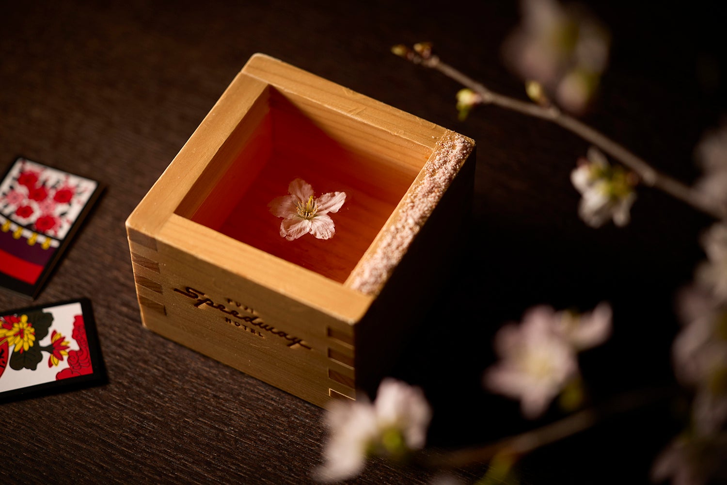 この春一押しのカクテル「花見で一杯」は、花札の役“花見で一杯”にインスパイアされたカクテル。静岡県の地酒・志太泉をベースに、桜風味の紅茶、桜シロップ、ライムジュース、ソーダを合わせ、すっきりとした飲み心地に仕上げました。升の縁に添えた桜塩と、そっと浮かべた桜の花びらが、春らしい遊び心を演出します。