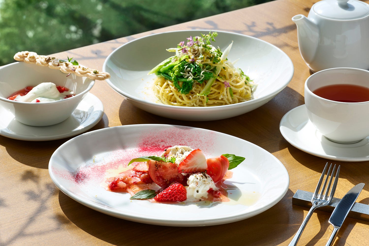 その中でもおすすめは、旬のしらすの旨みと春野菜の瑞々しさが広がる「スパゲッティ アーリオ・オーリオ」、ホテルからほど近いセリザワマルシェ(御殿場市)の春苺と高糖度アメーラトマトの甘酸っぱいハーモニーを楽しむカプレーゼ、そして、春苺のスープに爽やかなミントの香りを添え、ピスタチオ入りのサクサクとしたメレンゲをあしらったパンナコッタなど、春らしい彩りと香りをお楽しみいただけます。