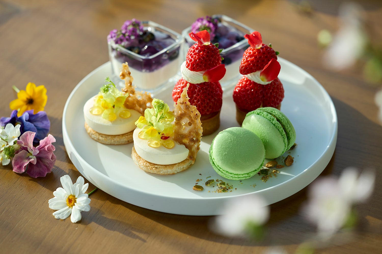 淡い紫のグラデーションが、静かな春の夜明けを思わせる「パンナコッタ バイオレットゼリー」は、ヨーグルトの爽やかさにスミレのエッセンスが重なる繊細な味わい。柔らかな春の陽射しのように明るい色味の「フロマージュブランのムースとはちみつ風味のチュイール」は、しっとりと焼き上げたダックワーズ生地とクリーミーなムースが織りなす食感のコントラストが魅力。「静岡県産苺と金柑のタルト」は、ジューシーな苺の甘みと相性の良い金柑のほろ苦さが重なり、ふわりと香るバラ風味のしずくが、春の庭園を思わせます。新緑の季節へ向かう彩りを表現した「ピスタチオのマカロン」は、新しく就任したペストリーシェフ中島のシグネチャーメニューのひとつ。ひと口で違いがわかる軽やかな食感と、ピスタチオの香ばしさをしっかり感じられるクリームが、春の深まりを感じさせます。これら4種類のスイーツの並びは「春の陽の移り変わり」を表す順になっており、順番に食すと一層楽しめる構成になっています。