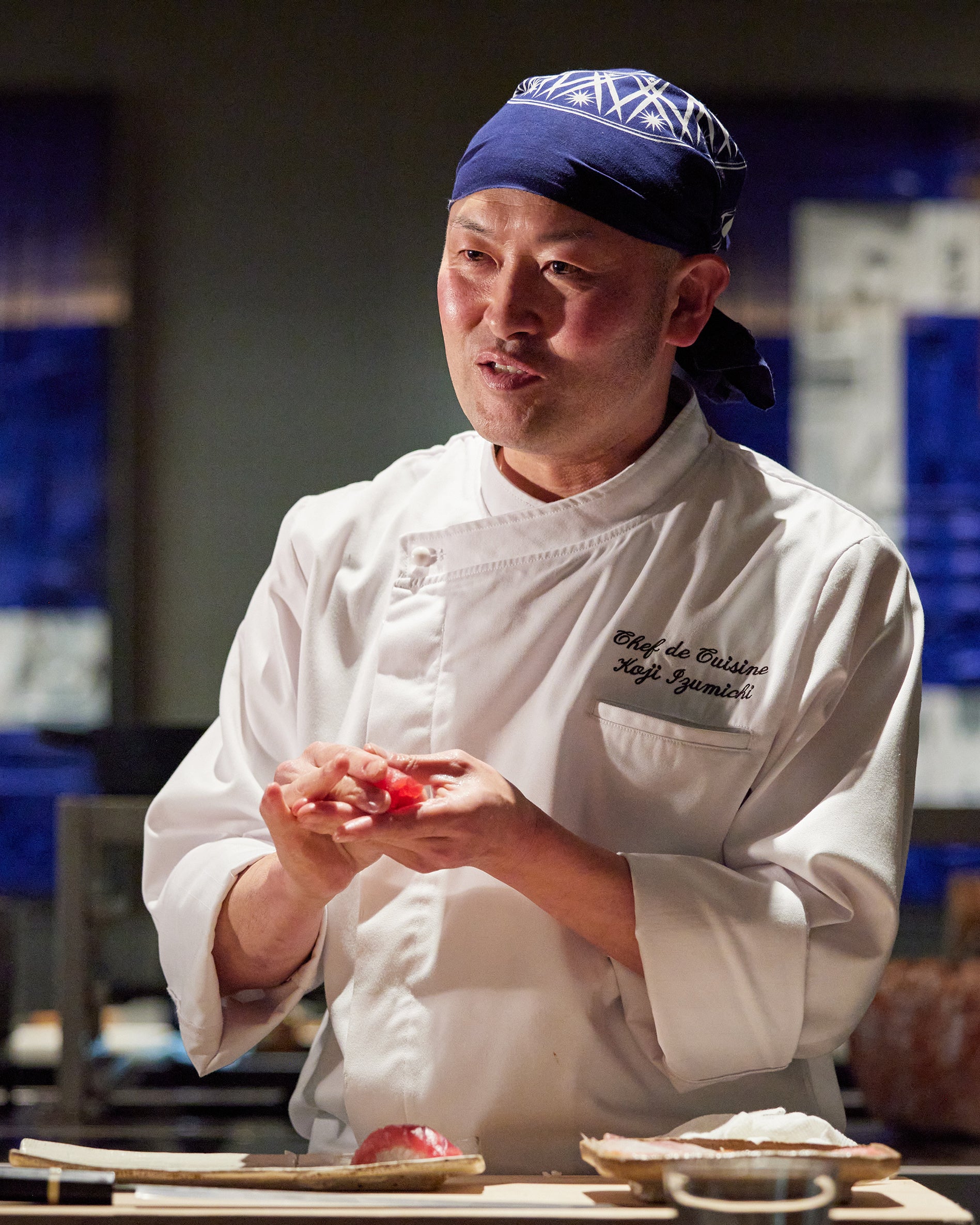 静岡県生まれの寿司職人で、25年以上の経験を持つ泉地浩二は、2025年2月に「ふじのくに食の都仕事人」として静岡県より表彰されました。泉地は、「魚介のみならず、野菜や畜産物の魅力にも目を向け、その良さを最大限に引き出すための調理技術を日々磨いています。また、生産者や納入業者の方々との密接な協力関係を構築し、食材の背景にあるストーリーや品質にこだわることで、より一層お客様にご満足いただける料理を提供していきたいと考えています。」と語ります。