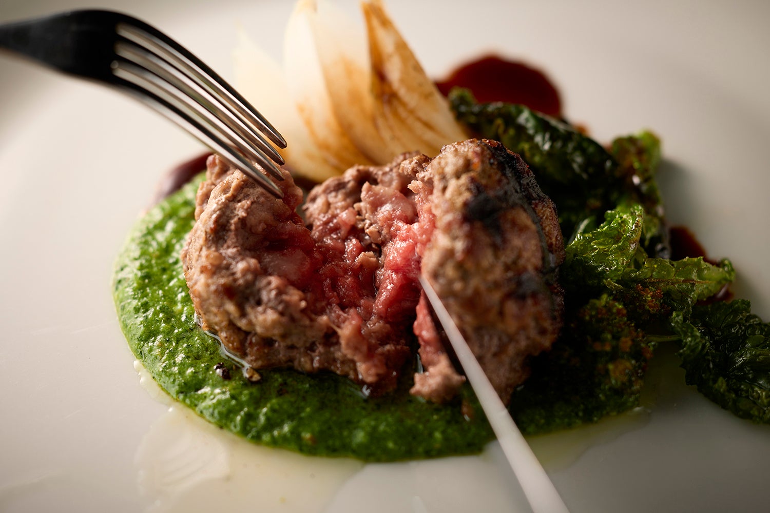 メイン料理のおすすめは、国産牛のハンバーググリル。こぶし大の丸いパテに焼き目を付けた後、オーブンでじっくり火を入れることで旨味を凝縮し、外は香ばしく中は驚くほど柔らかい仕上がりに。新緑を思わせる鮮やかなグリーンのサルサベルデが清々しいアクセントとなり、グリルした新玉ねぎとバルサミコ酢が味わいを可憐にまとめます。