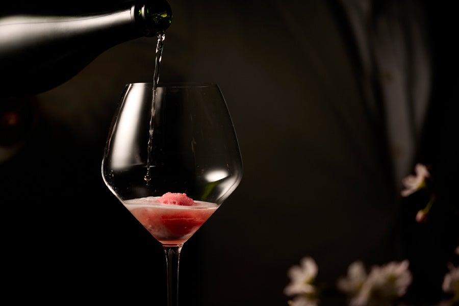 「桜スパークリングソルベ」は、満開の桜をイメージ。自家製の桜シャーベットに、エルダーフラワーやローズの華やかな香りを重ね、ノンアルコールのスパークリングワインの軽やかな泡が春爛漫の表情を引き立てます。