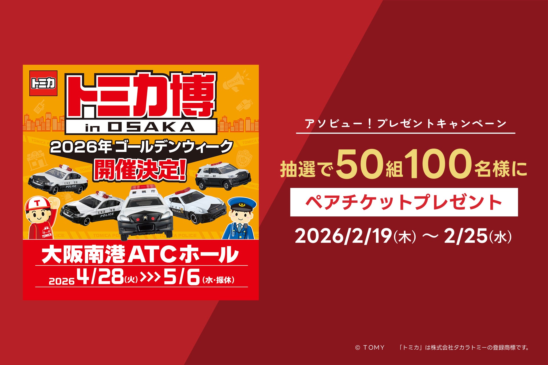 休日の便利でお得な遊び予約サービス「アソビュー!」(URL:https://app.adjust.com/138x1dst、以下:アソビュー!)を運営するアソビュー株式会社(所在地:東京都品川区、代表執行役員CEO:山野智久、以下:当社)は、「トミカ博 in OSAKA<大人・子どもペアチケット>」が抽選で50組100名様に当たるプレゼントキャンペーンを、2026年2月19日(木)より開始します。