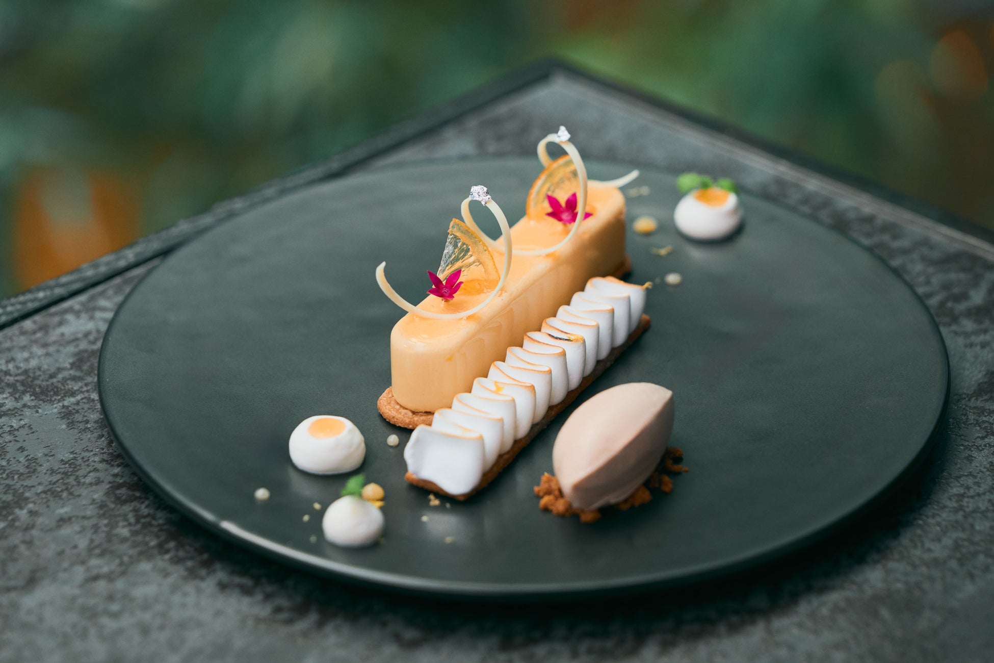 はちみつレモンムースの中に、酸味の効いたレモンクリームを隠した一皿。 ムースの傍らには、香ばしく焼き色をつけたイタリアンメレンゲを添えています。レモンティーアイスの優しい甘みと、ケーキのキレのある酸味がもたらす心地よい余韻を感じていただけます。
