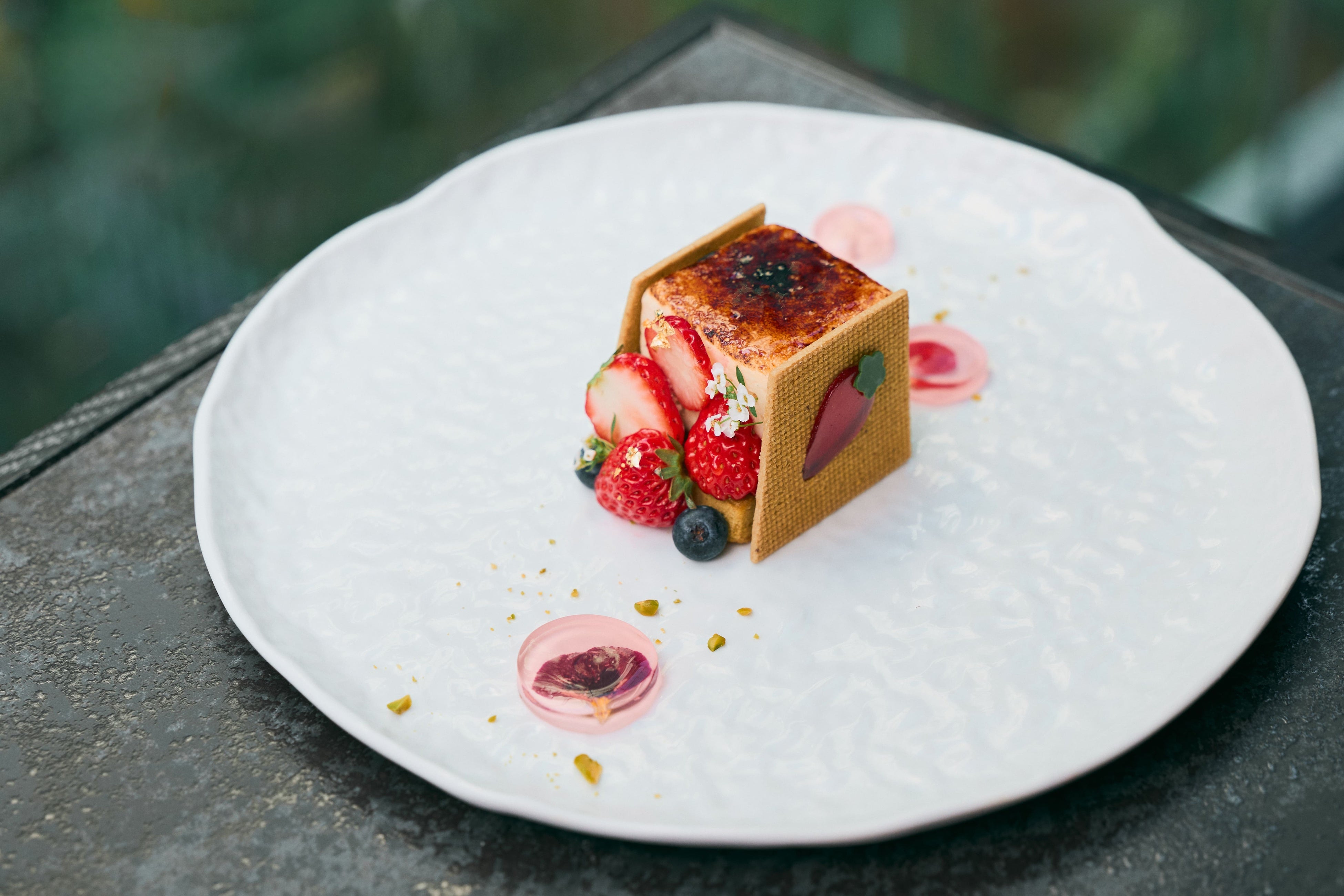 淡くきらめく飴の球体に、桜餡を使用した自家製ジェラートやラズベリー、マスカルポーネのムースを重ねました。もっちりとした桜求肥と、土台のダックワーズによる食感の変化も楽しい一品です。