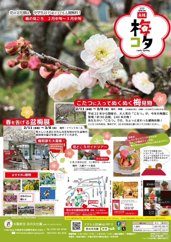 河内長野市にある植物園「大阪府立花の文化園」では、約 90 品種、およそ 240 本の梅が咲き始めており、メイン会場である梅 園では、梅の開花にあわせてこたつに入って観梅を楽しめる人気イベント「梅コタ」を 2026 年 2 月 11 日(水)~3 月 8 日(日) まで開催します。