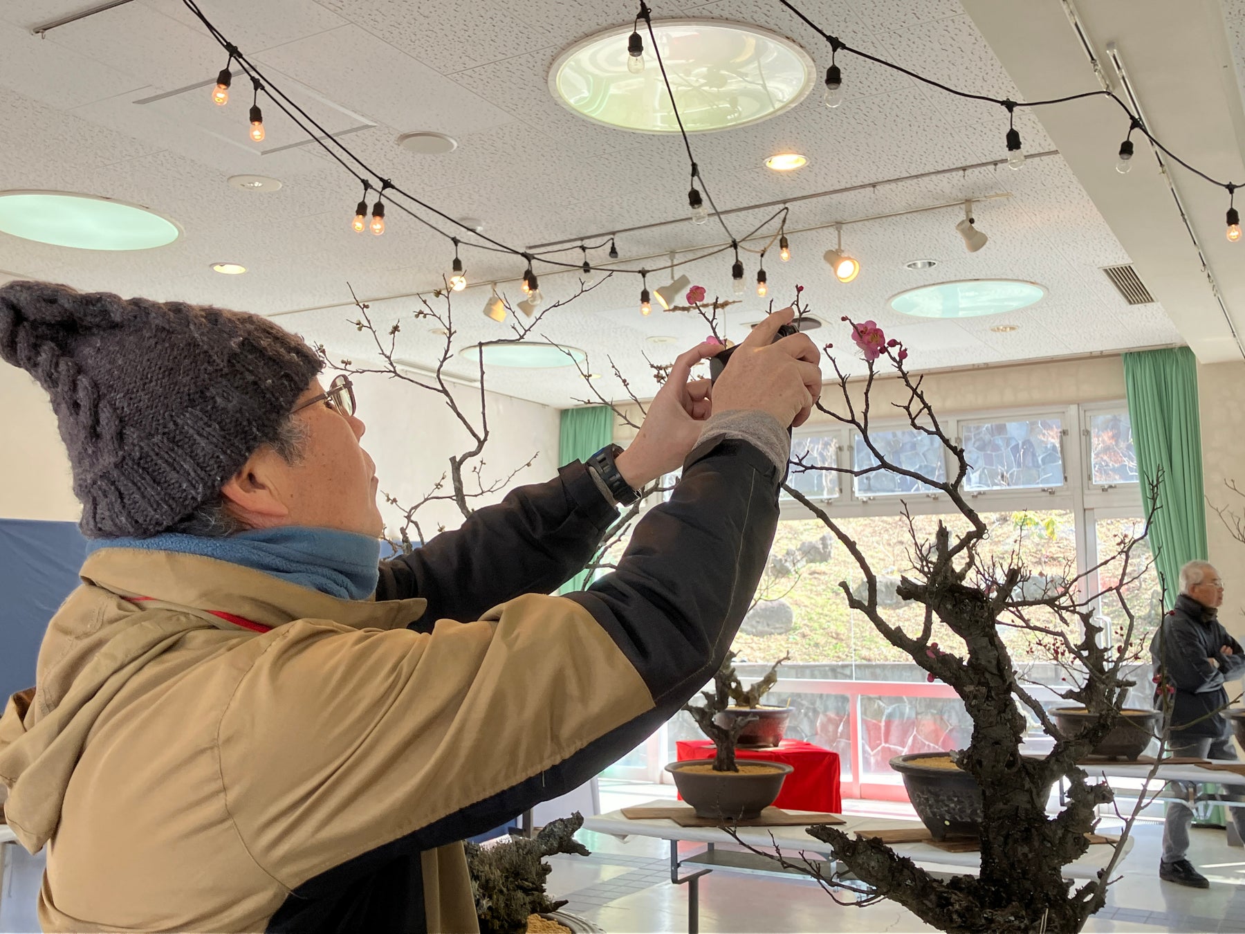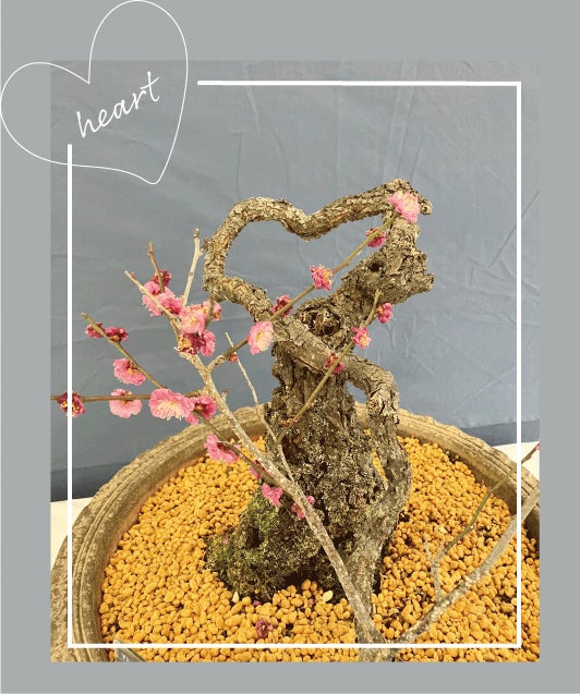 荒々しい木姿にかれんな花を咲かせた盆梅が、春到来の喜びを感じさせてくれます。