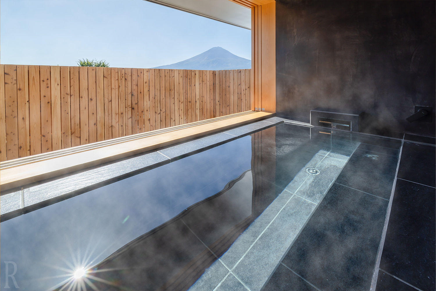 山梨県・富士河口湖町の自然豊かな環境に佇み、四季折々に移ろう山の景色と澄んだ空気に包まれたロケーションが魅力。館内には黒を基調とした落ち着きある空間に、富士山を望む開放的な半露天風呂を備えており、湯に浸かりながら雄大な景色を独り占めできます。