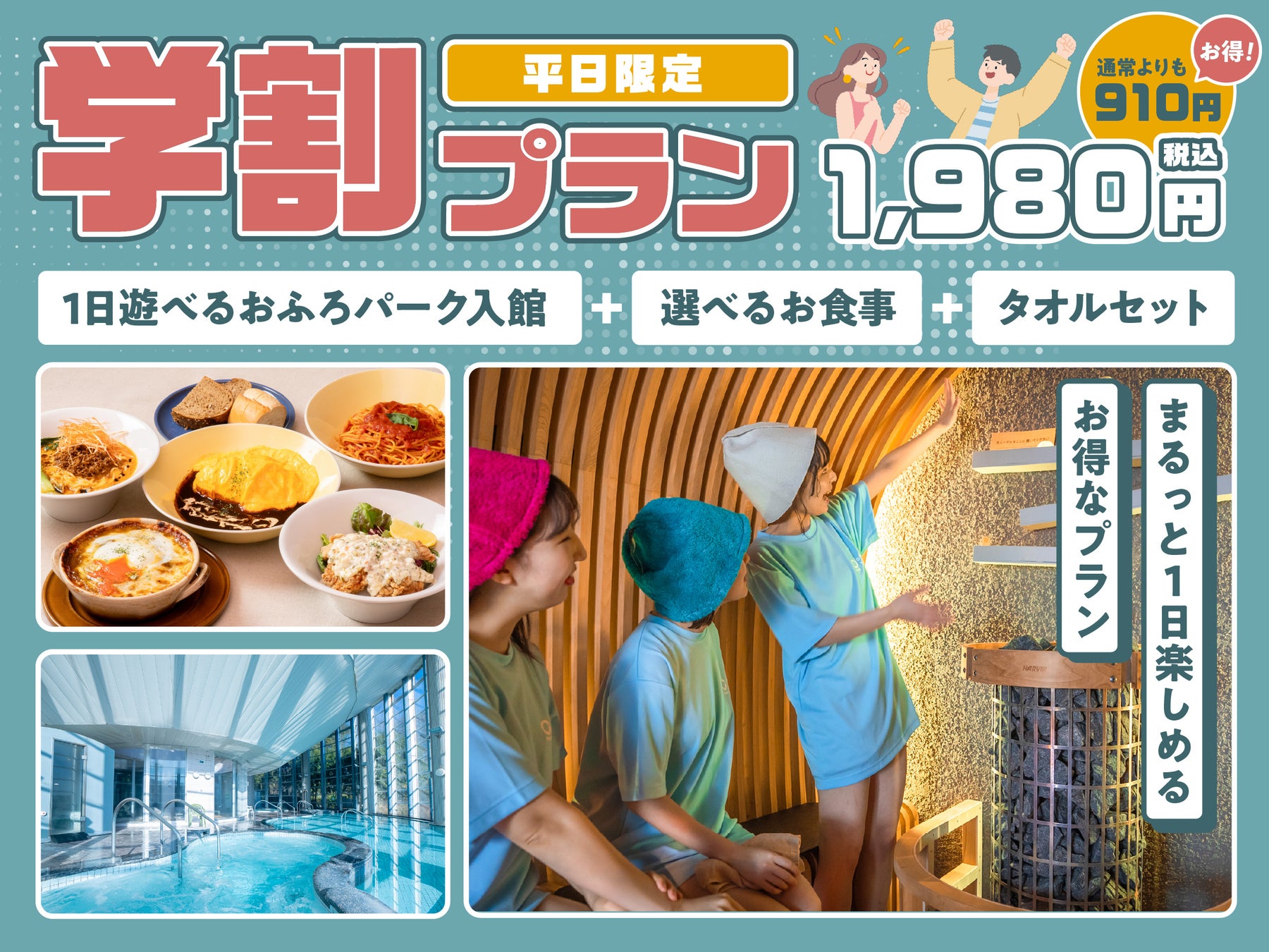 本プランは、通常最大2,890円相当(入浴1,580円+お食事980円+タオルレンタル330円)の内容を、一律1,980円でご利用いただける学生限定プランです。放課後の利用や平日の空いた時間に、友人同士で1日ゆっくりとお過ごしいただけます。