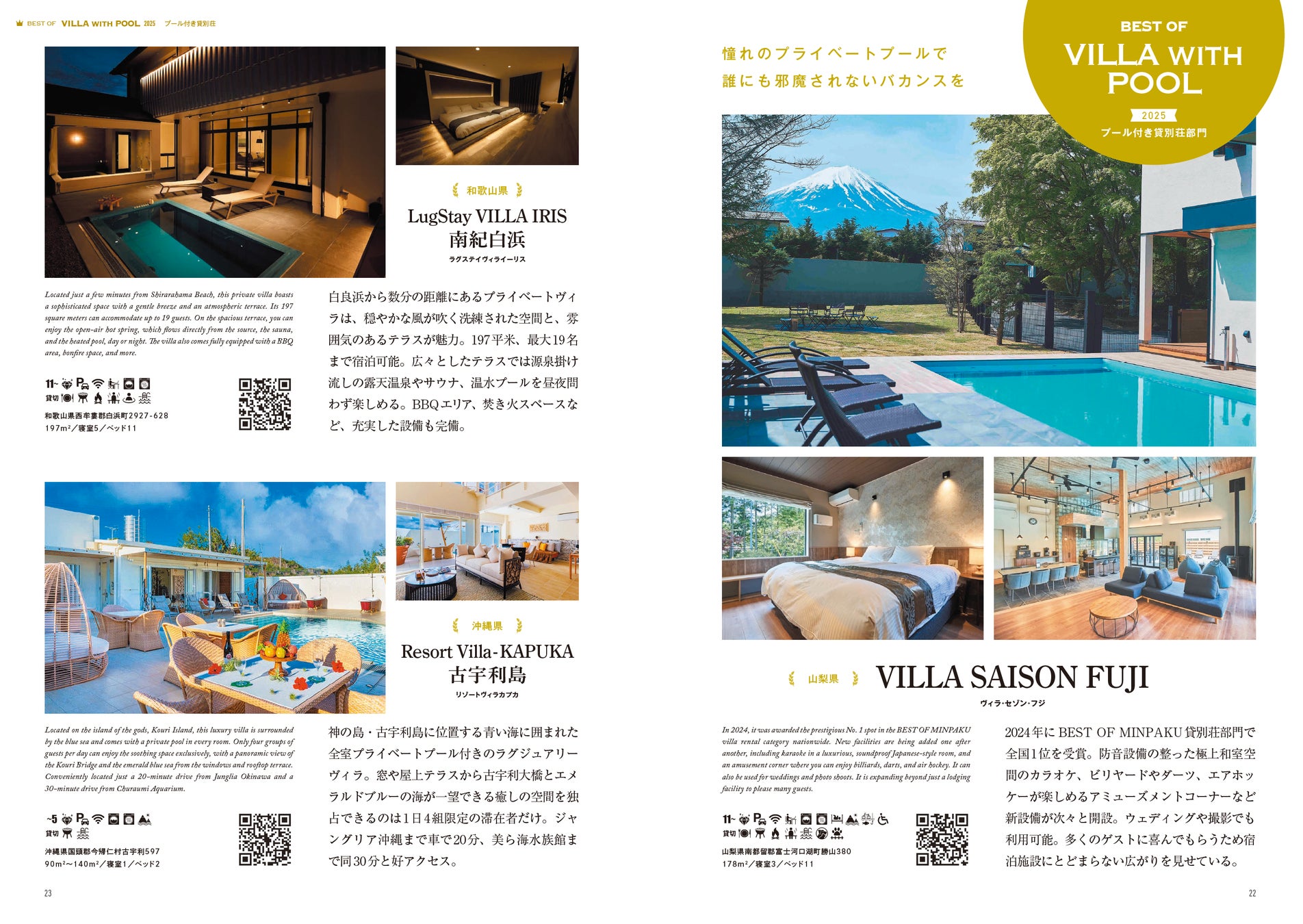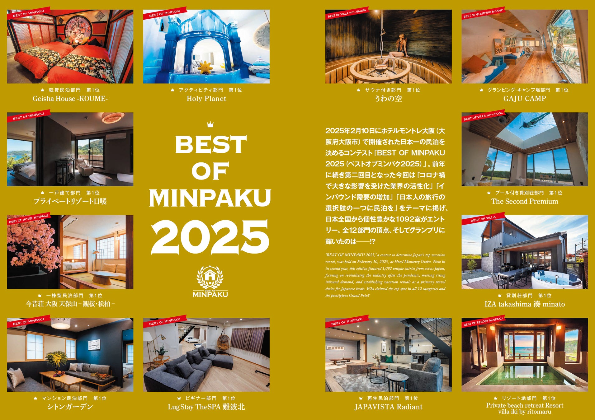 2月23日(月・祝)には第3回となる「BEST OF MINPAKU 2026」が開催。主催の民泊専門家、榊原啓祐・田尻夏樹によってまとめられた本書では、2025年、2024年の過去2年間で高い評価を得た173施設を一挙掲載し、「民泊」の魅力を余すところなくお届けします。