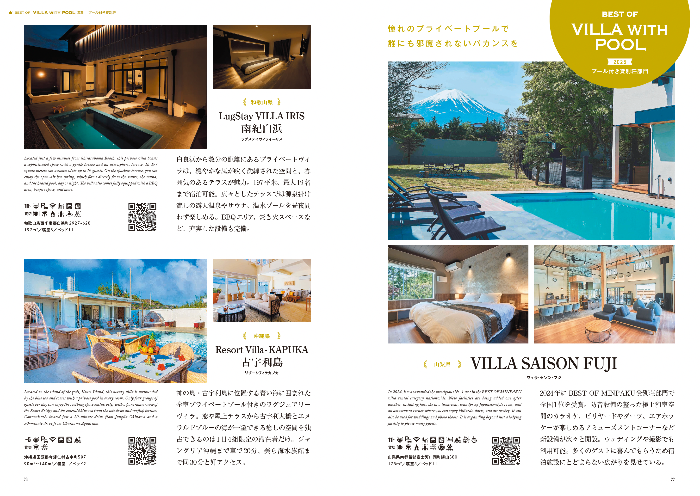 2月23日(月・祝)には第3回となる「BEST OF MINPAKU 2026」が開催。主催の民泊専門家、榊原啓祐・田尻夏樹によってまとめられた本書では、2025年、2024年の過去2年間で高い評価を得た173施設を一挙掲載し、「民泊」の魅力を余すところなくお届けします。