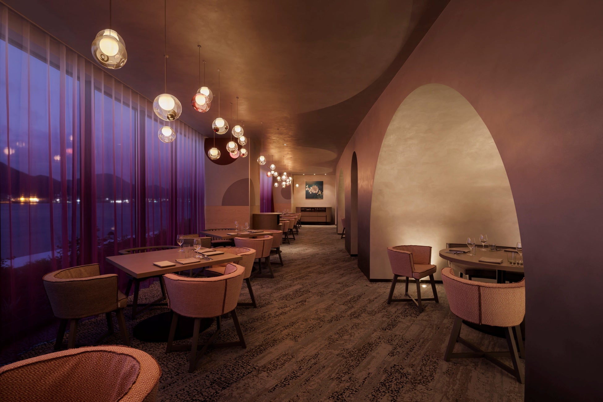 OTTO SETTE SHIMONOSEKIは、深海をイメージした空間デザインが特徴です。海底から海面にむけて明るくなる様子を表現したグラデーションの壁面と、水泡を思わせるペンダントライトが、夜の海の静かなきらめきを表現しています。また、足元には海底の砂利を想起させるデザインのカーペットが広がり、海底の洞窟を彷彿とさせるプライベート感のあるアーチ状の席も特徴的です。どの席からも関門海峡を挟んだ対岸の夜景を眺めながら、食事を楽しめます。