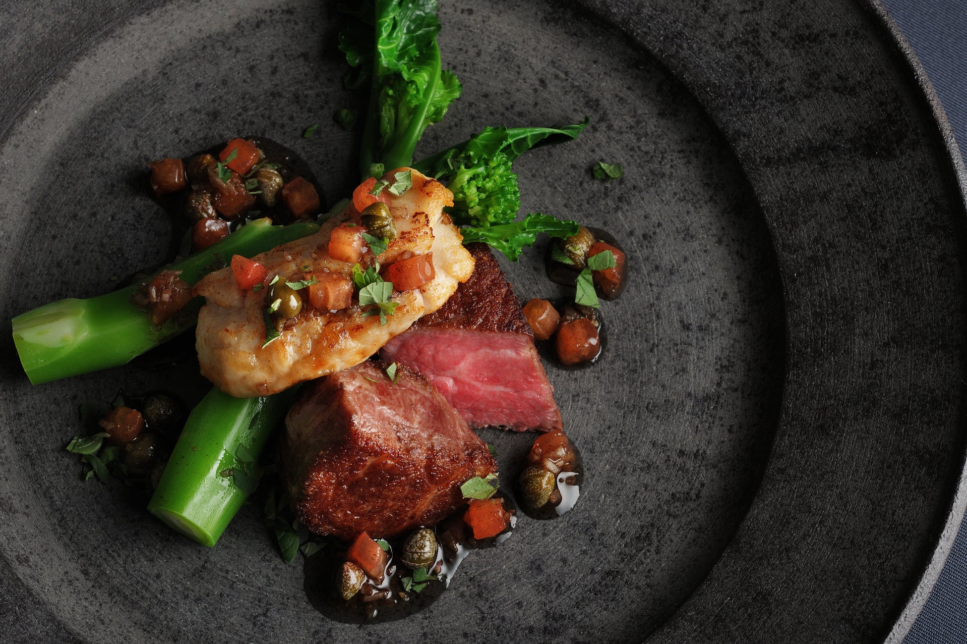 表面を芳ばしく焼き上げた白子と、柔らかな牛フィレ肉を組み合わせた一皿です。アンチョビやふぐの魚醤入りのコクのある焦がしバターソースで、料理全体の一体感を引き立てます。