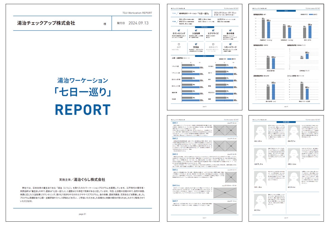 「湯治チェックアップ」により可視化された参加者様の結果は、集計・分析のうえ「健康経営レポート」として結果をお戻しいたします。お渡ししたレポートに基づき、特定の社員や部門に過度なストレスがかかっていないか等の組織診断にも応用することができ、「個別最適化された自社でのアフターフォロー」も可能となります。