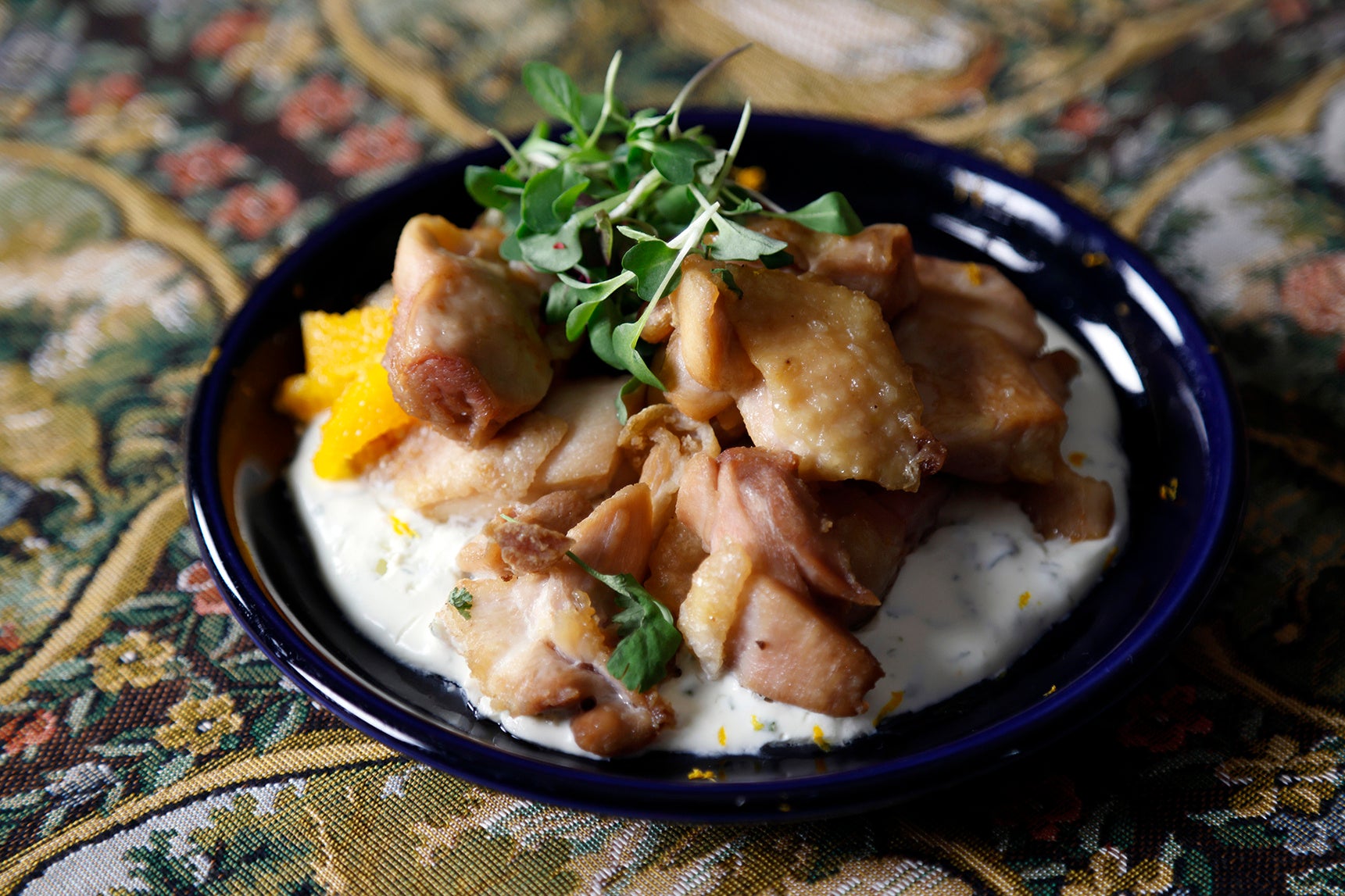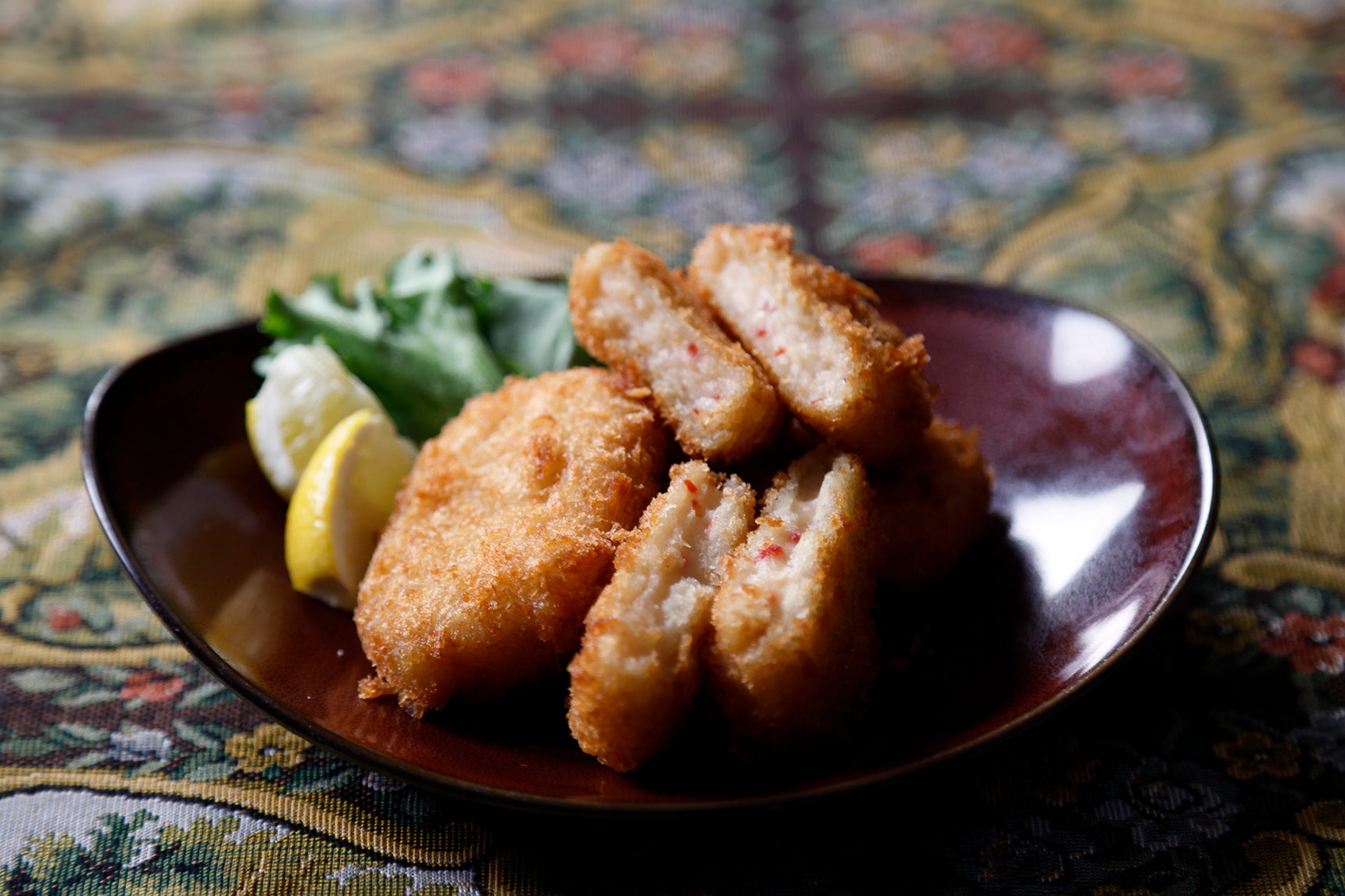 蟹クリームコロッケ / 鶏肉のロースト 柑橘風味のサワークリームソース / 魚介のマリネ 明日葉のソース / ミートグラタン