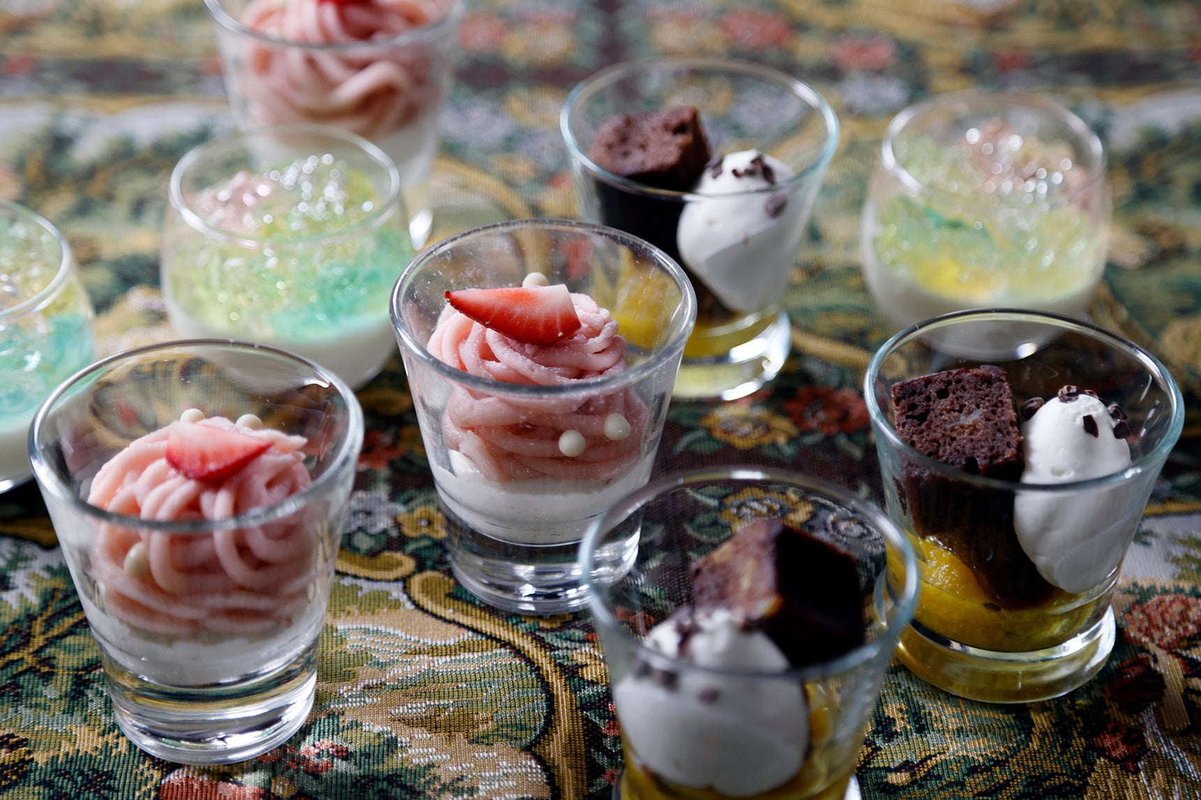 グラスデザート 3種(桜香るモンブラン / パンナコッタとクリスタルジュレ / ケークショコラとオレンジコンフィチュール)/ クレーム・ブリュレ / キャラメルバナナブラウニー / フィナンシェとコンディメンツ(ワゴンスイーツ)/ ジェラート 10種 / ポップコーン