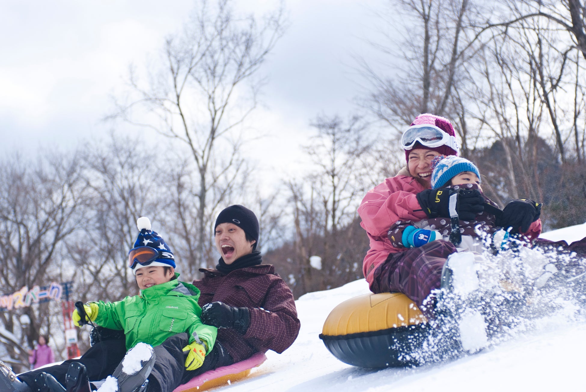 めいほうスキー場のもうひとつの魅力は、大規模なスノーランドです。エリア内には、ムービングベルト(スノーエスカレーター)が設置されており、チュービングコース、スノーストライダー等の雪遊びスポットが充実しています。チューブやソリ、スノーストライダーのレンタル代も入場料に含まれており、お得にご利用いただけます。また3歳から6歳のキッズを対象としたスクールBURTONKID’S RIGRET PARKや、ファミリー向けレストラン、託児所などの施設もあり、小さなお子様がいらっしゃるお客様も1日ゆっくりお過ごしいただけます。