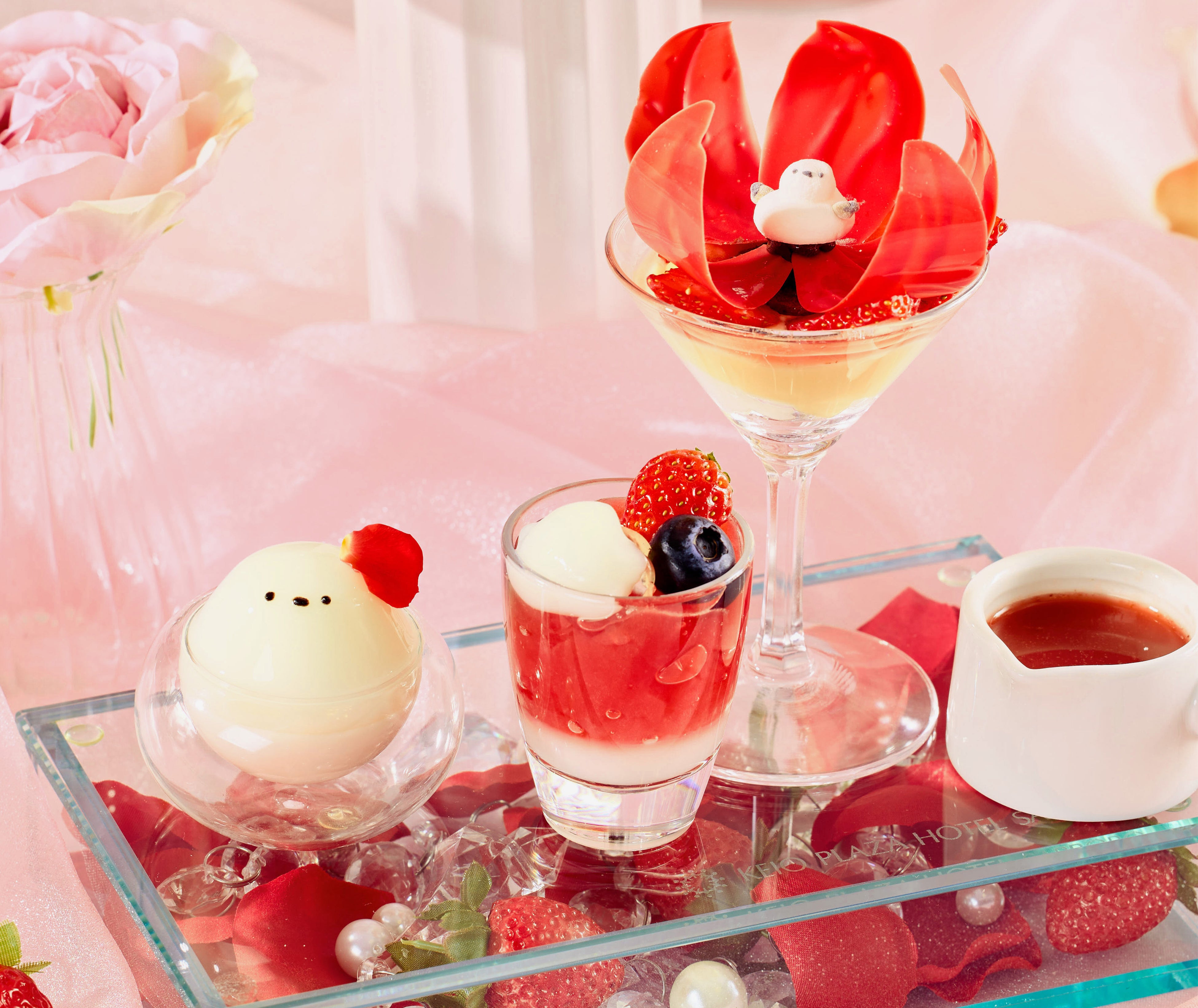 チョコレートの赤い花の中には、春の訪れを喜ぶシマエナガが!前回大人気だった揺れるシマエナガゼリーも再び登場しました。