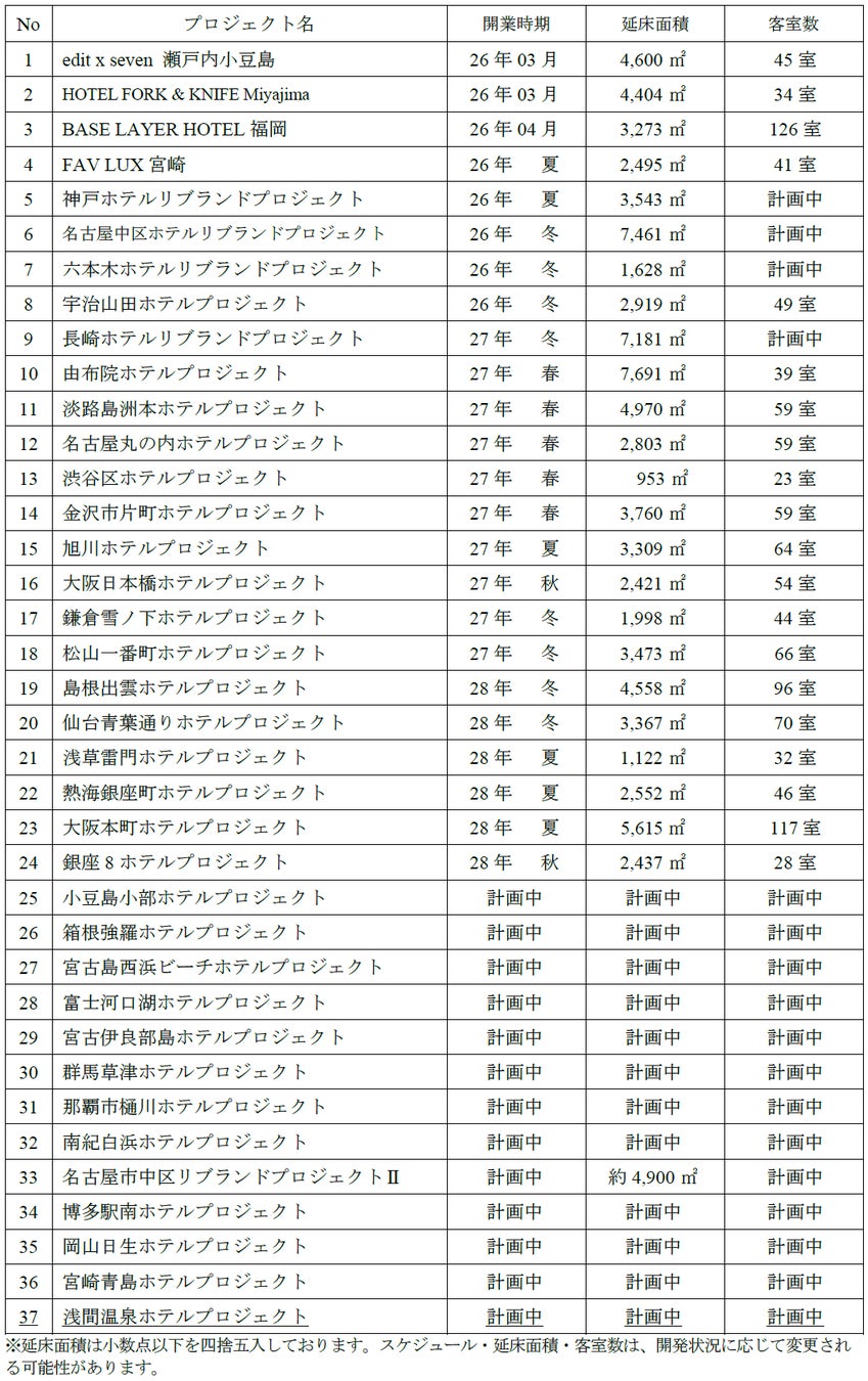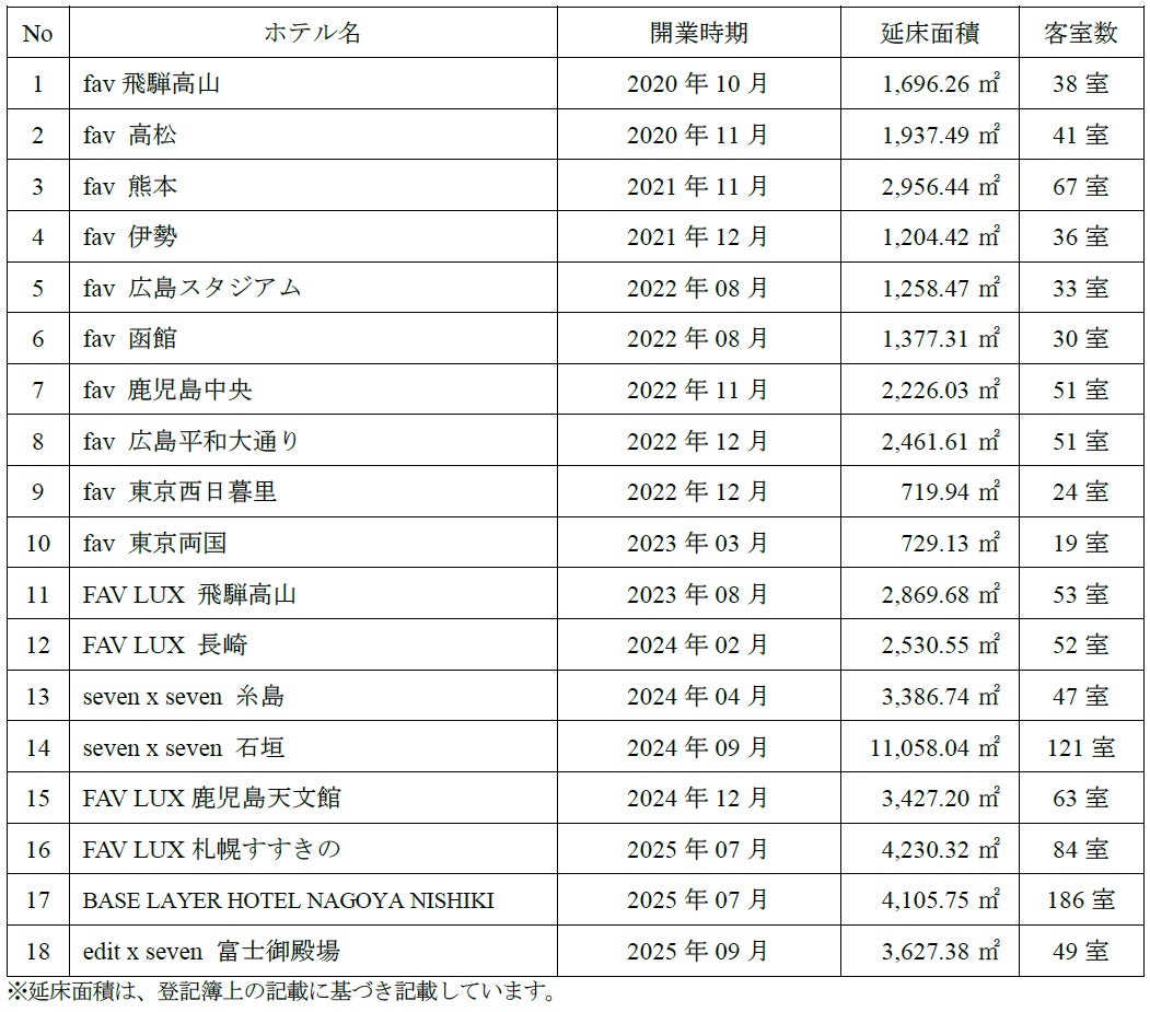 当社は、観光立国の実現や地域創生への貢献を目的にホテルの開発に取り組んでおり、多人数向けホテルブランド『fav』『FAV LUX』『edit x seven』『seven x seven』、およびカルチャービジネスホテル『BASE LAYER HOTEL』を全国で展開しております。このたび、当社グループの多人数向けホテルブランドの開発用地を新たに販売用不動産として取得いたしました。