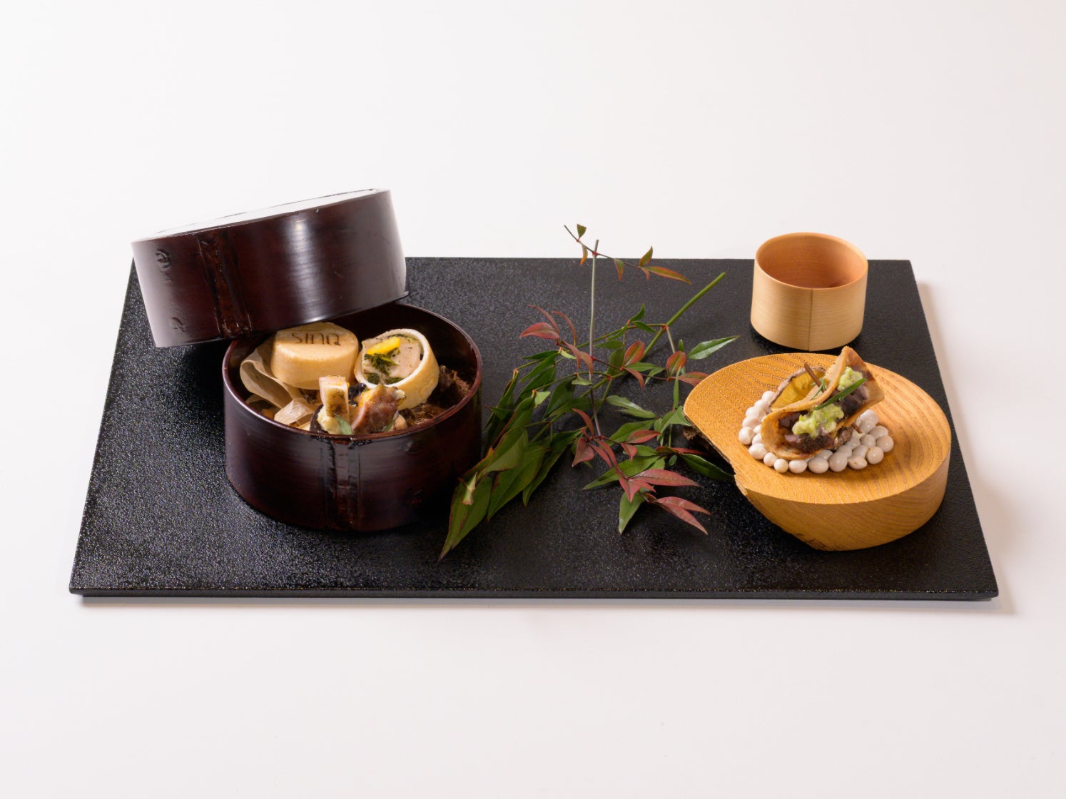 てしゃまんく最中を模し、里芋親芋と自家製味噌の塩餡、井川茶でマリネした駿河軍鶏胸肉のハムと発酵柚子、ヒノキ香るもも肉ハム、発酵椎茸のクレープには鹿醤で焼いた井川鹿、タマゴササギと落花生味噌、山葵塩麹を。 ペアリングに初摘み茶と萩錦の麹水に桧を合わせた「めぐり」。