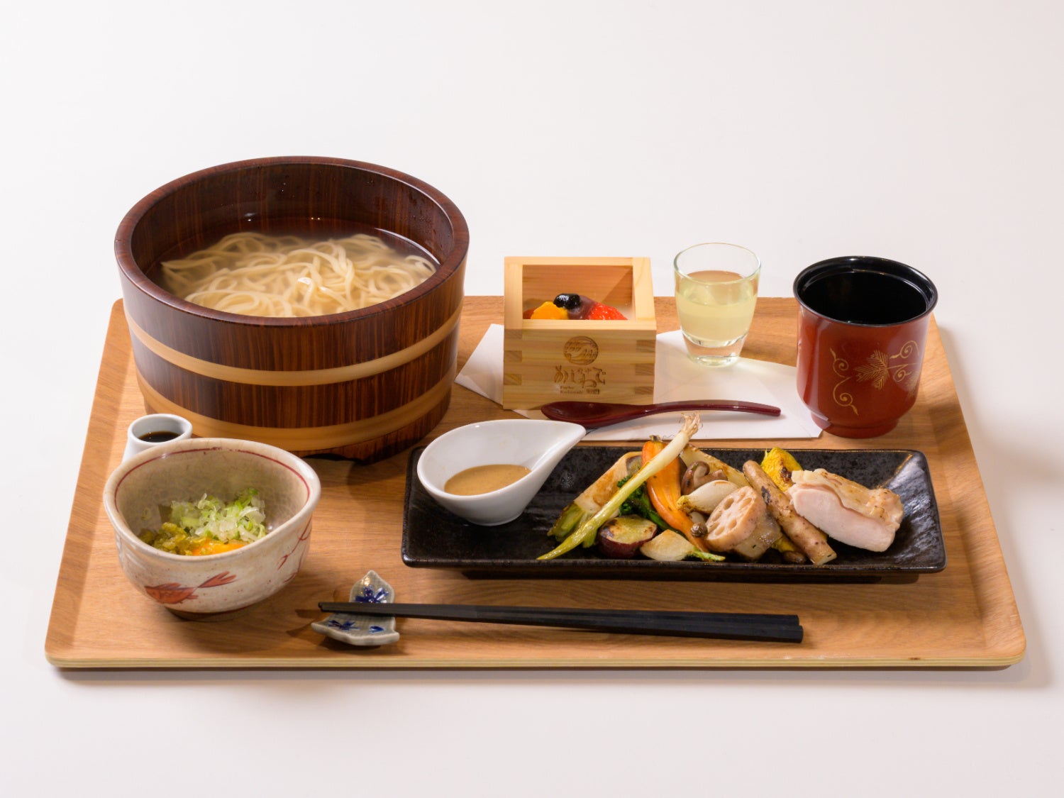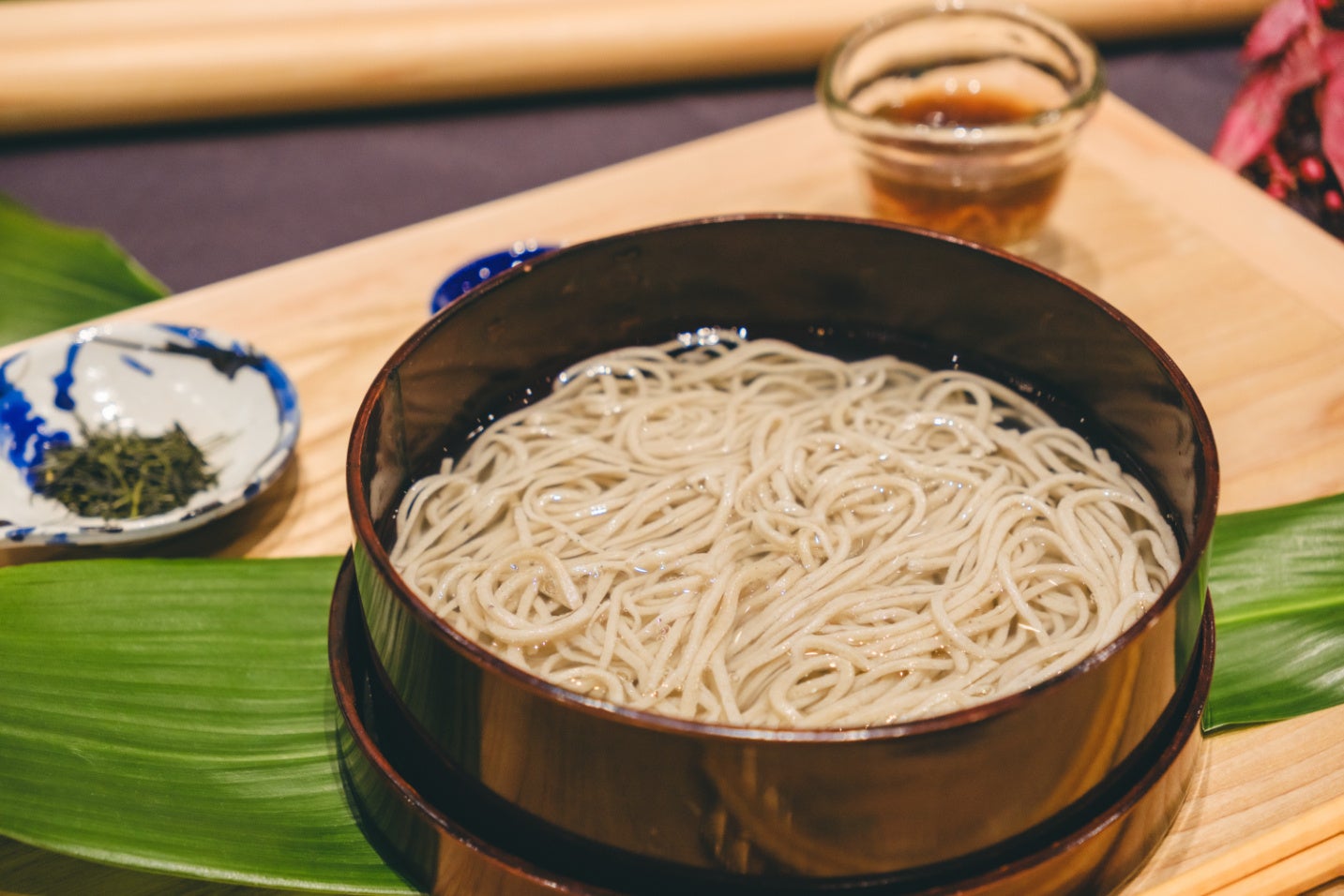 井川の焼畑・静岡在来蕎麦を、地下60メートルから自噴する安倍川の伏流水で水蕎麦としてご用意。 清水のかぶせ茶からは低温抽出した旨味を、用宗の生しらすからは鮮烈な出汁を。 南アルプスから駿河湾へ―高低差およそ6000メートルを誇る雄大な静岡の、山と川と海の恵みを堪能できます。