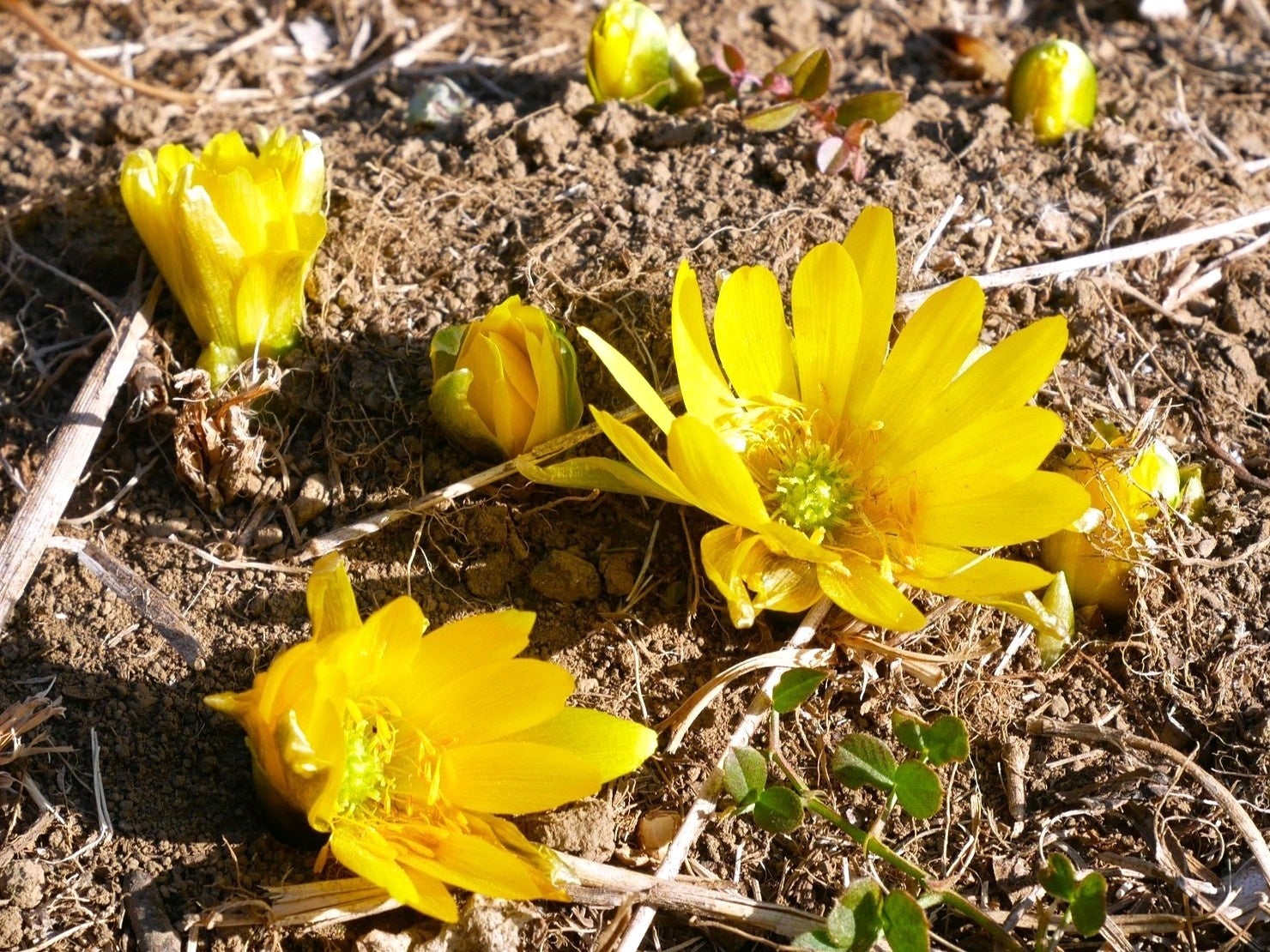 陽だまりに顔を出す「福寿草」