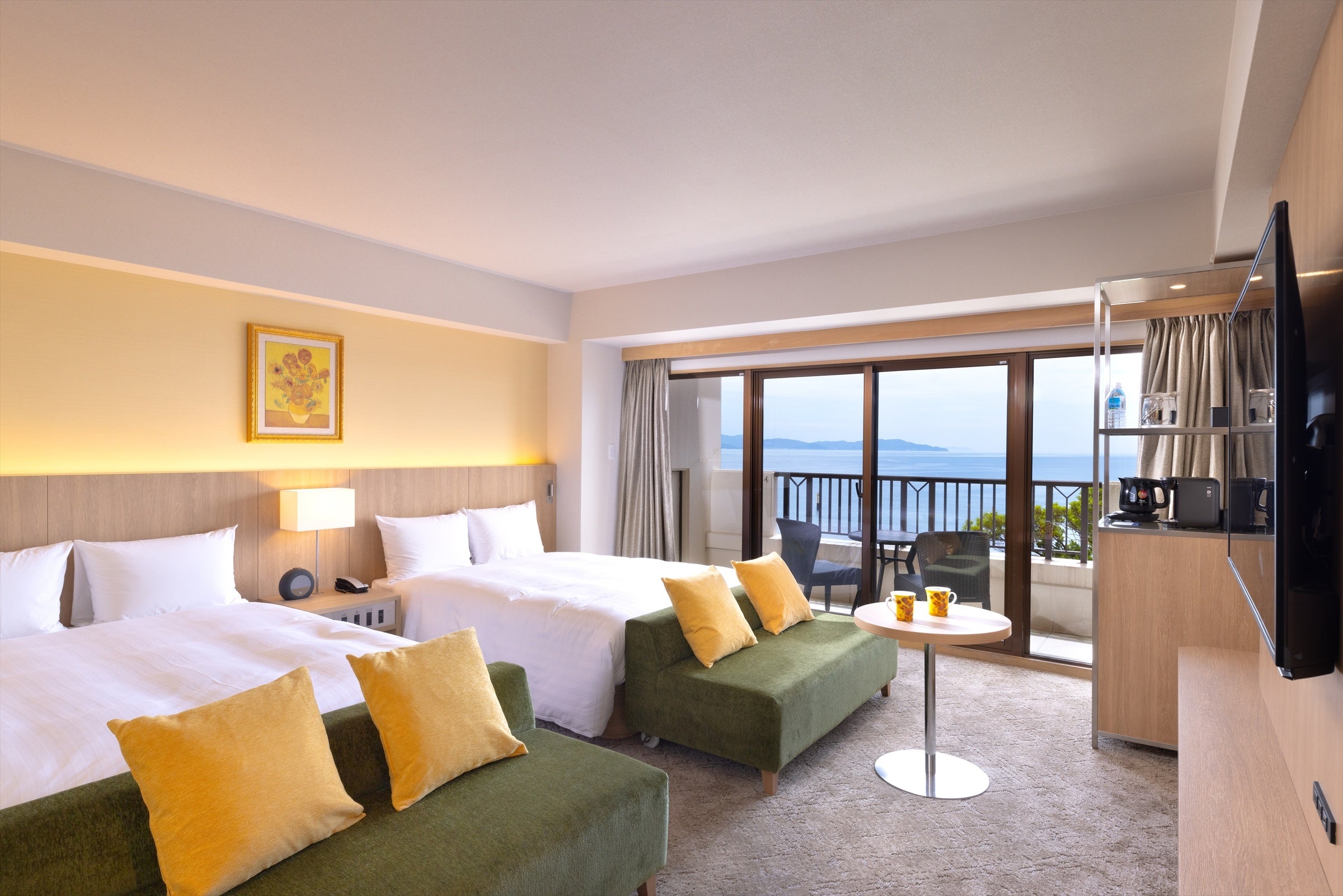 バルコニー付きの洋室や和室、阿波藍や大谷焼アートを配した客室、ゴッホの世界観を体感するヒマワリルーム、ファミリーに嬉しい2段ベッド付きのリゾッ太ルームなど、旅のスタイルで選べる客室は15タイプ。